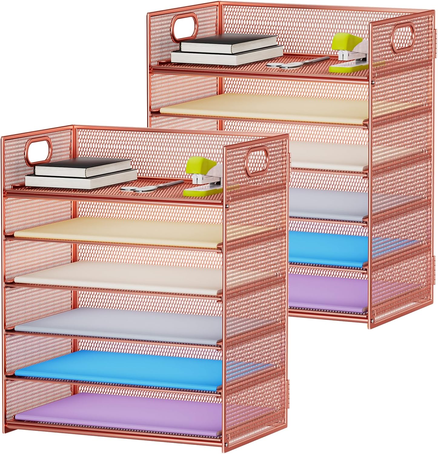 Marbrasse 2 Pack Desk Organizer with Handle, 6 Tier Paper Letter Tray, Mesh Desk File Organizer for Office, School and Home - Rose Gold