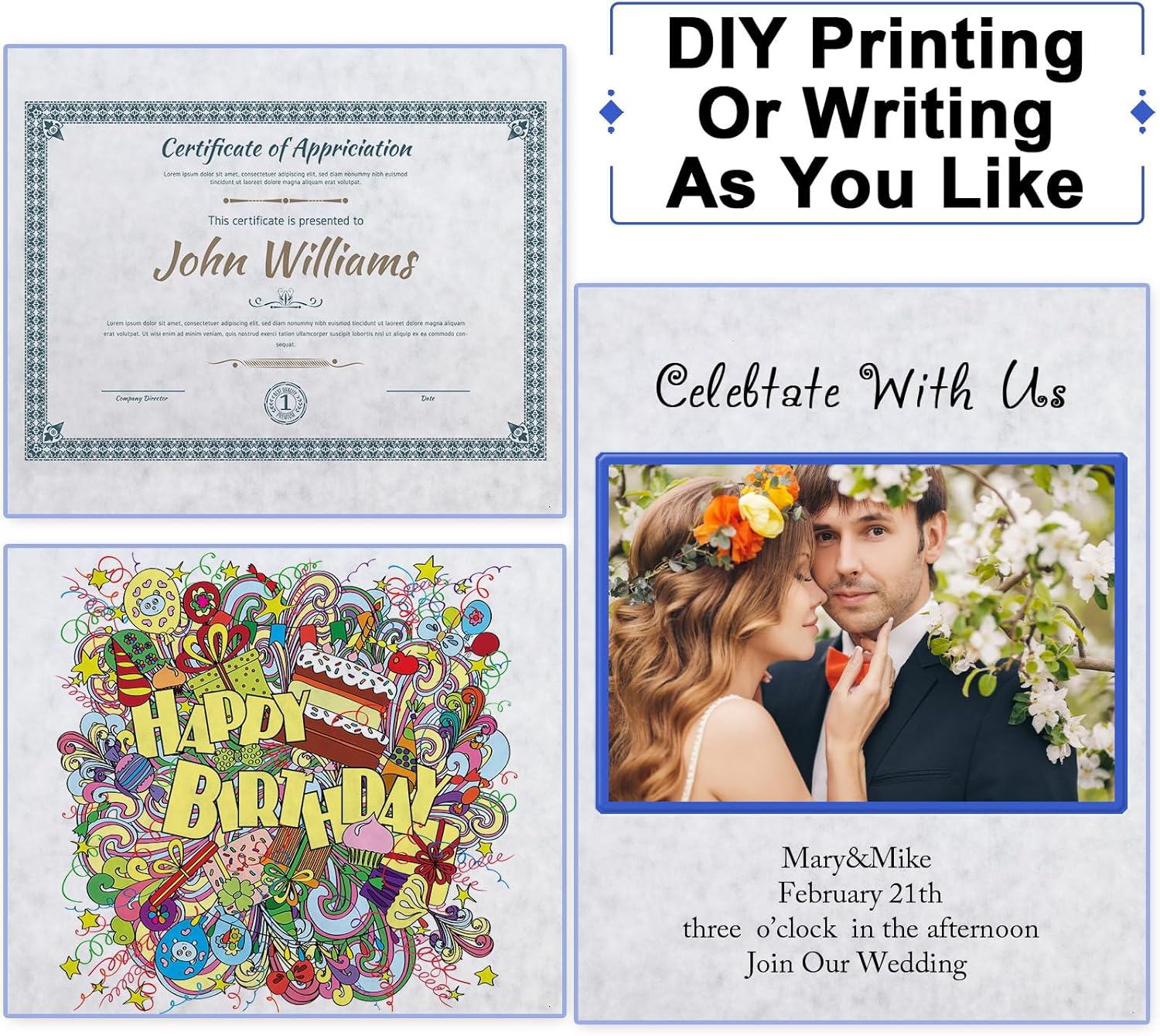 - Work As Different Things: these plain certificate papers are flexible in use, you can use them as certificate printing, wedding invitation, birthday invitation, restaurant menu, theme party decoration and so on, running smoothly in laser and inkjet printers, copiers and offset applications without jams