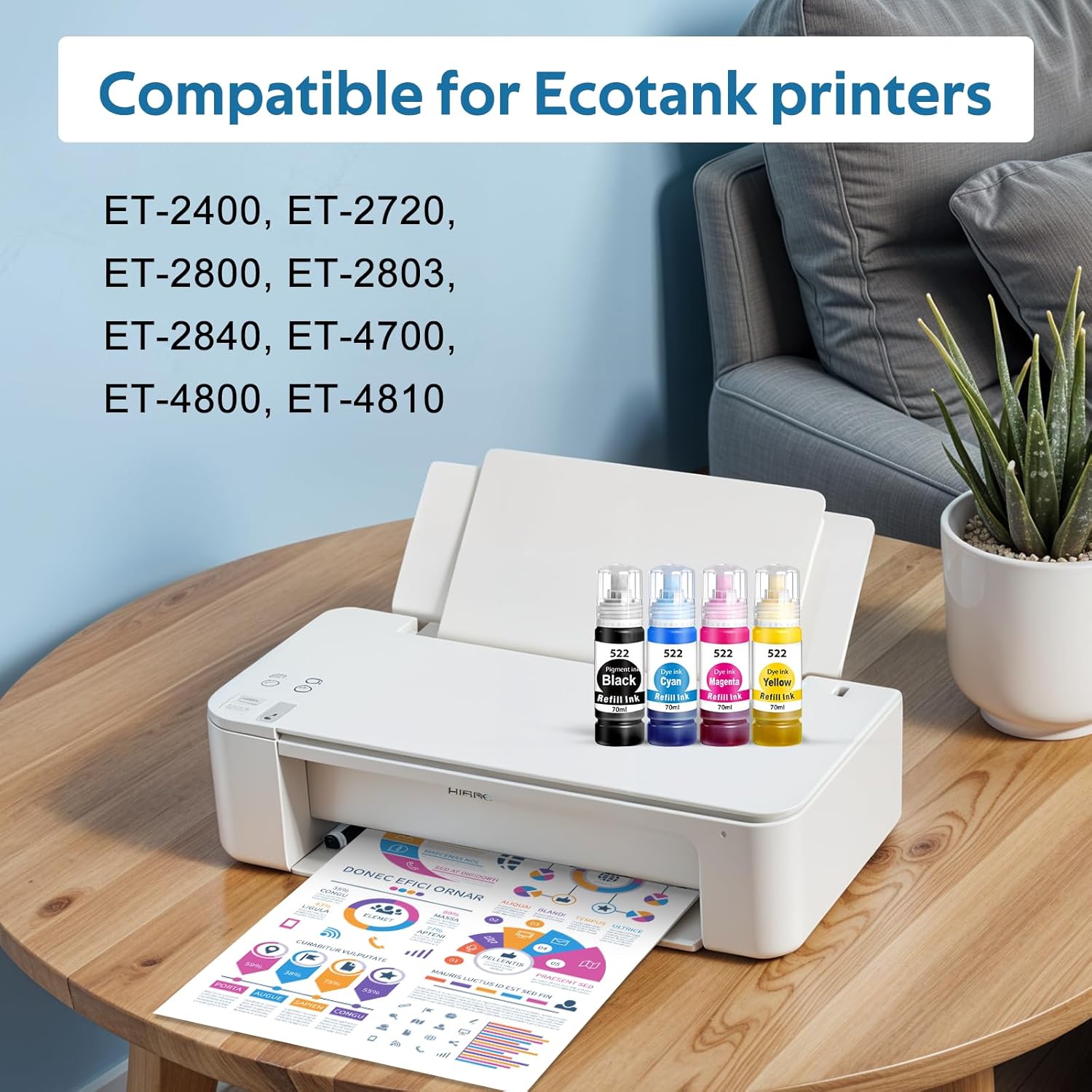 - Compatibility Options : Compatible for Epson 522 Ink Works with EcoTank ET-2400, ET-2720, ET-2800, ET-2803, ET-2840, ET-4700, ET-4800, ET-4810 Printer Compatible for Epson 522 Ink Works with EcoTank ET-2400, ET-2720, ET-2800, ET-2803, ET-2840, ET-4700, ET-4800, ET-4810 Printer