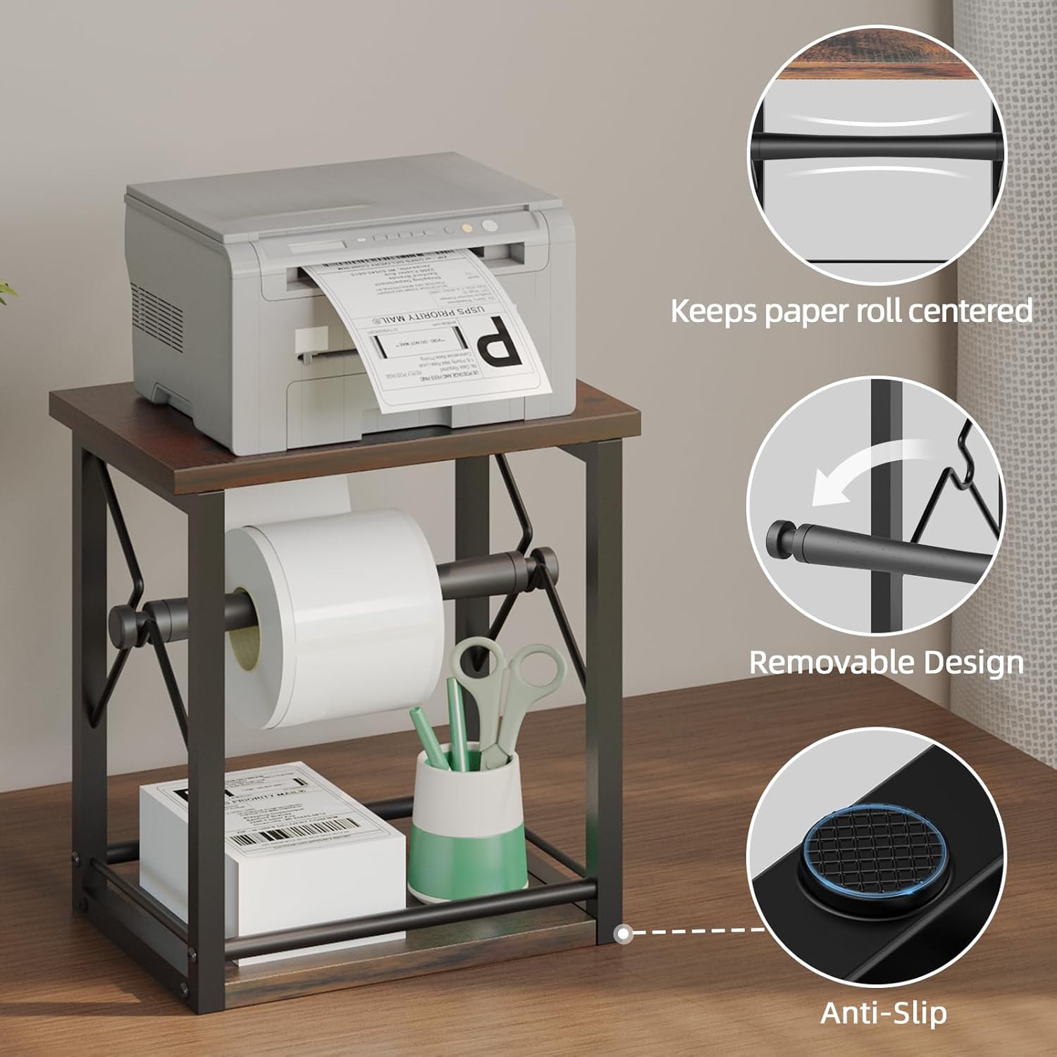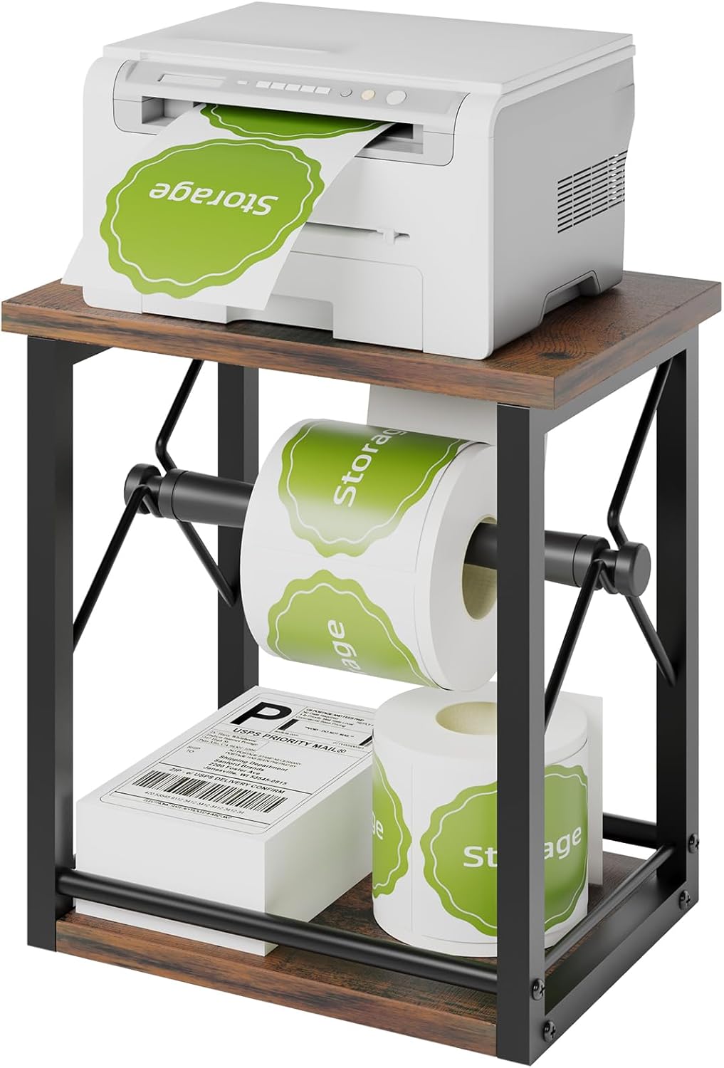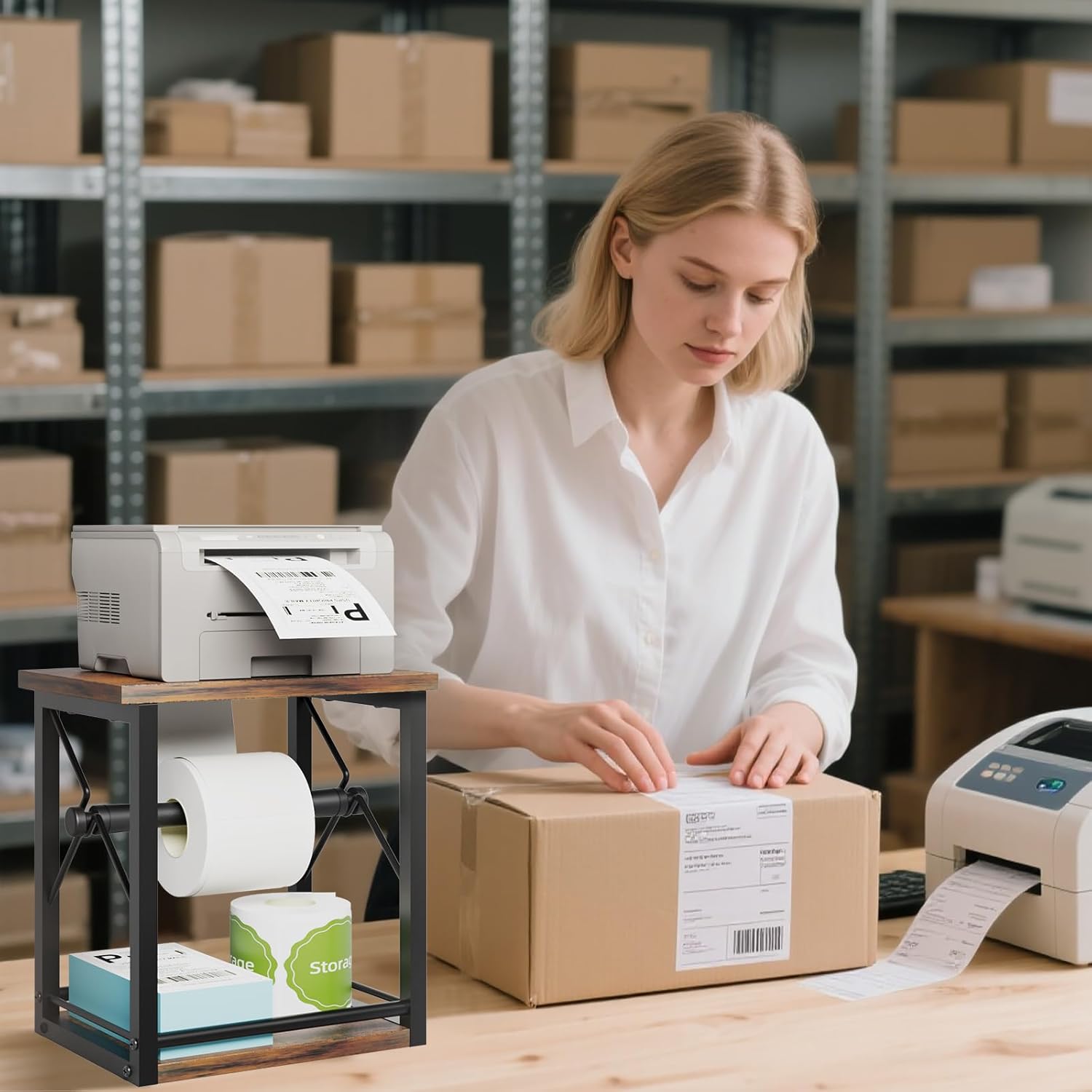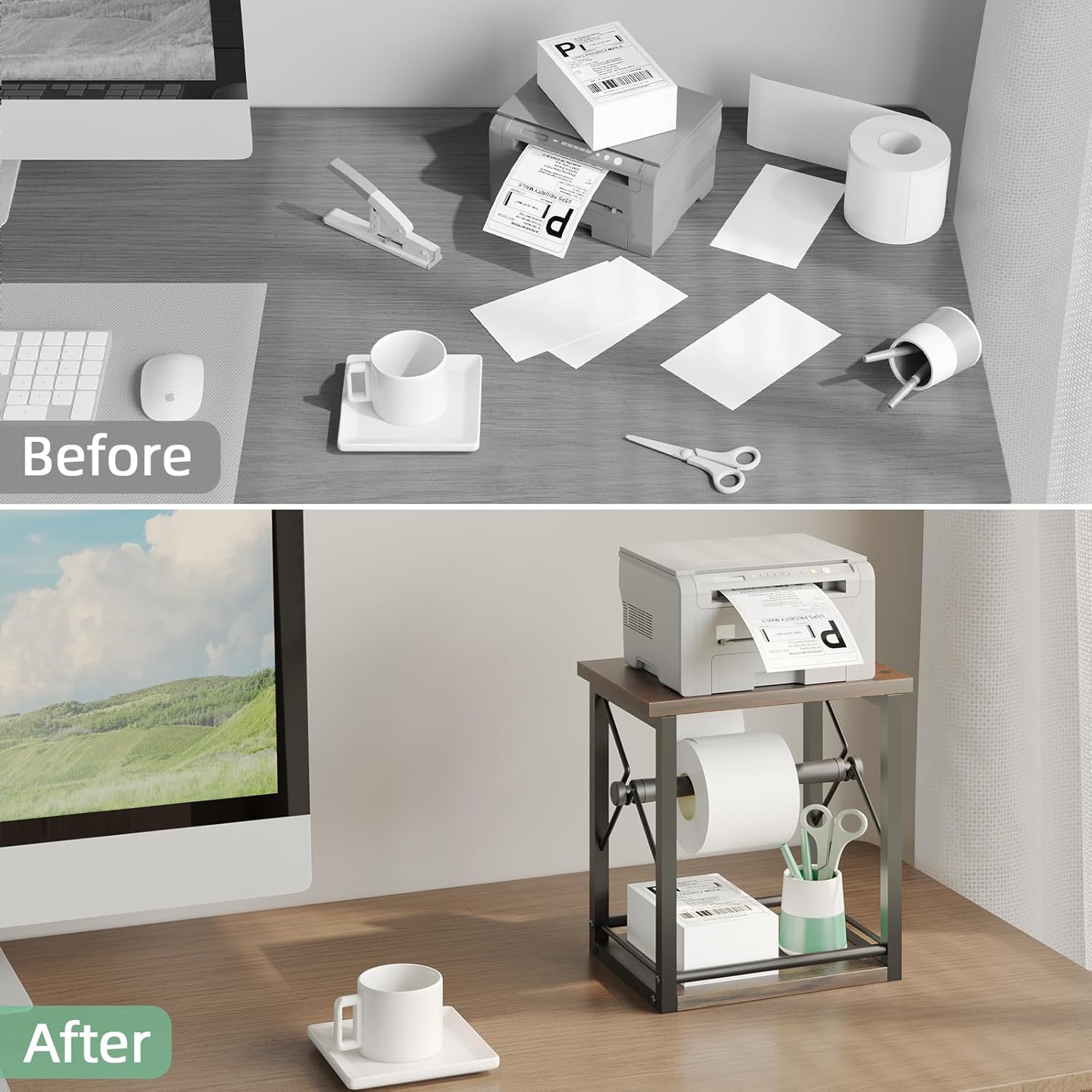 - [All-in-One Label Holder for Thermal Printers] Keep your workspace organized with this 2-tier thermal printer stand and label holder. The top accommodates most 4x6" thermal printers, the center roller serves as a label roll holder and sticker dispenser, while the bottom tray stores fan-fold labels or extra supplies. Ideal for use in shipping stations or home office setups.