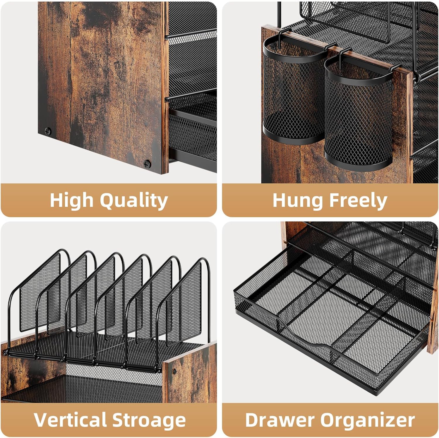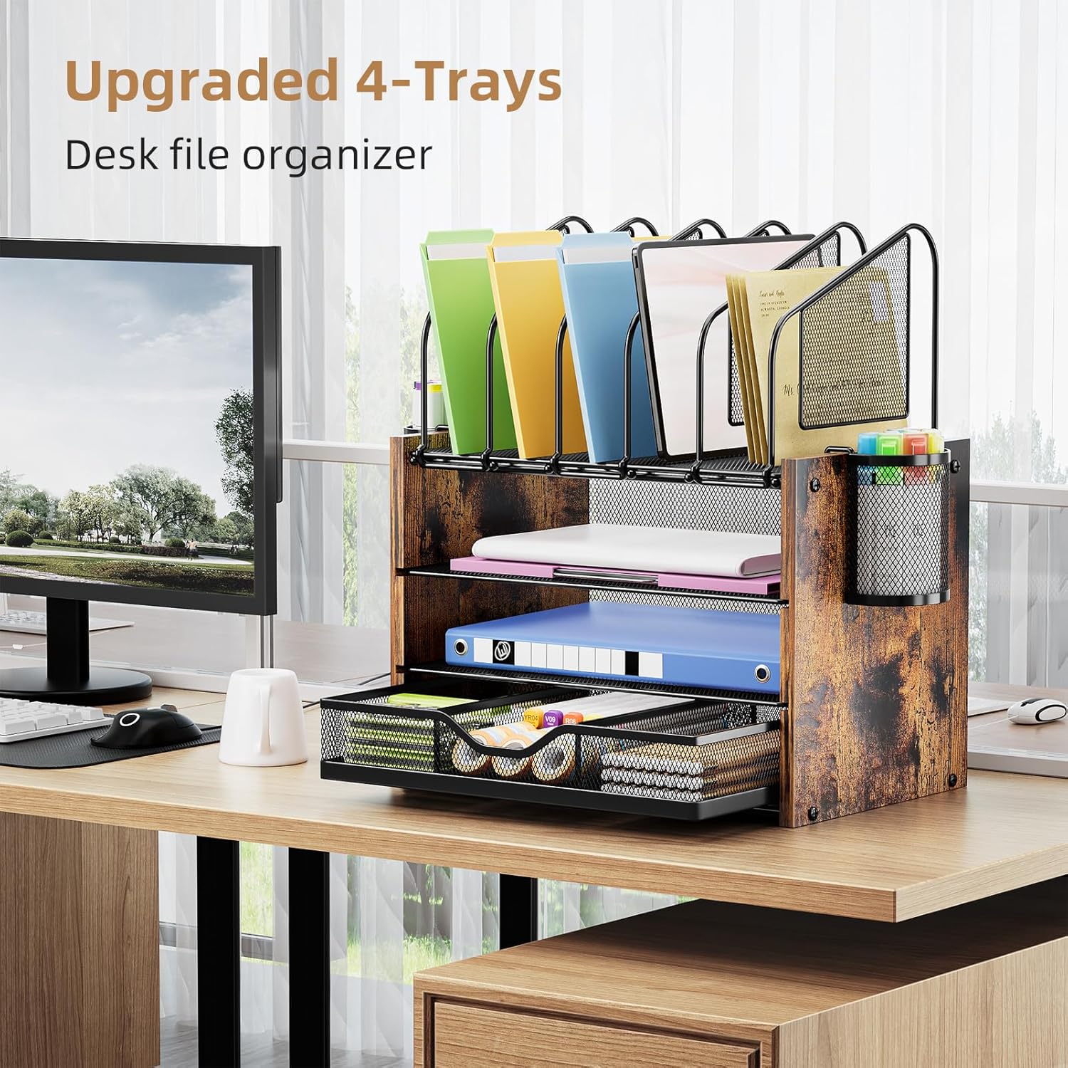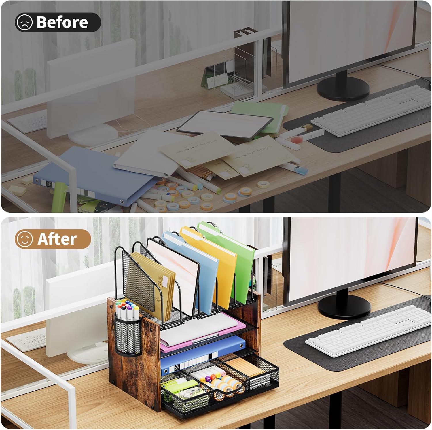 - ăMultifunctional Desk organizerăOur upgrade desktop file organizer has vertical and horizontal storage space â 4 Tiers +5 vertical sorters +3 compartments drawer+ additional 2 pen holders . Upright section has five 2" Compartments for magazines, bill, file, book. Three types of use to meet your various office needsďźďź