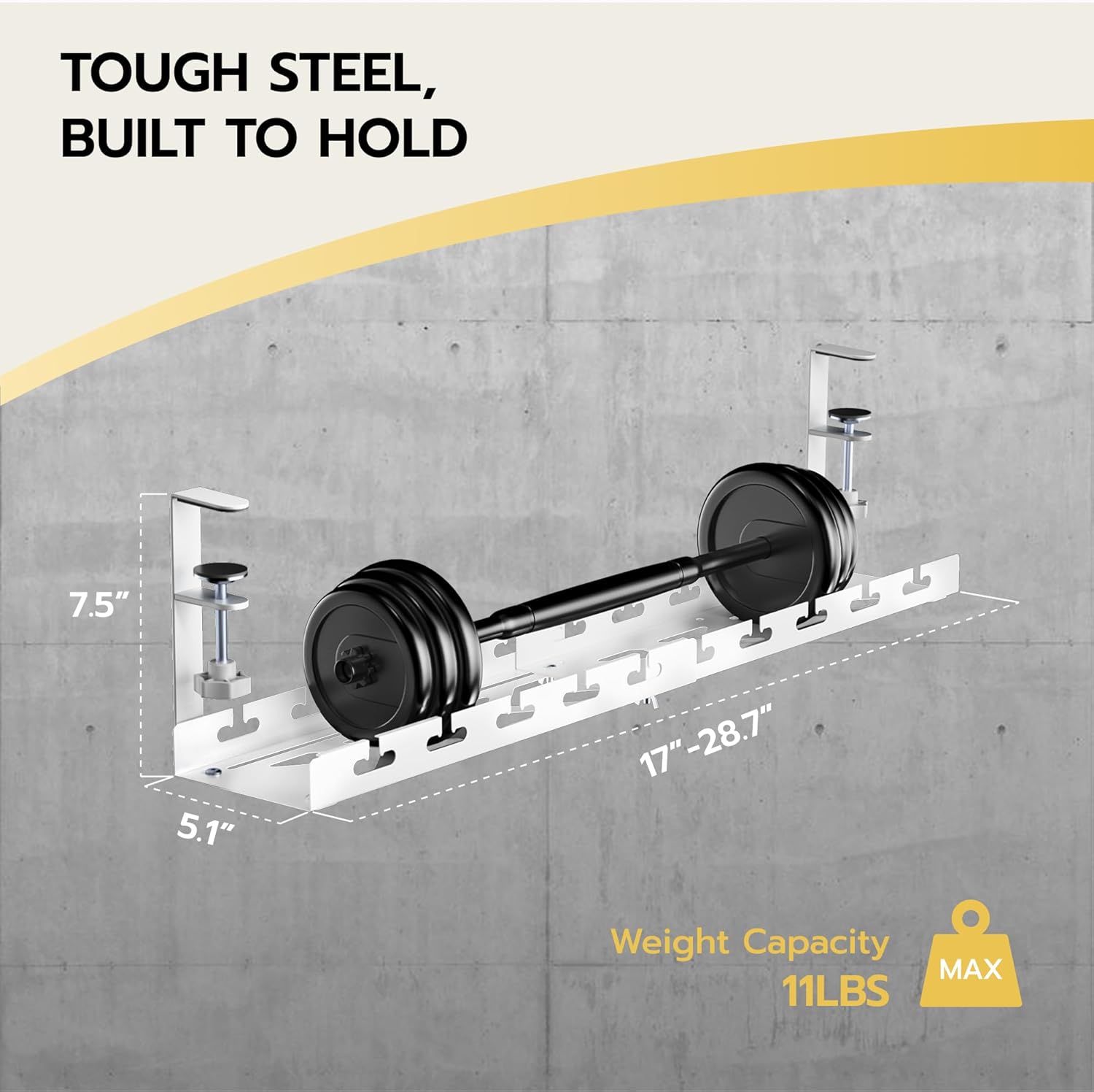 ARES WING 17"-28.7" Extendable Under Desk Cable Management Tray with Cable Slots, Clamp On Cord Organizer Holds Up to 11 lbs, White Metal Under Desk Storage for Office and Gaming Accessories