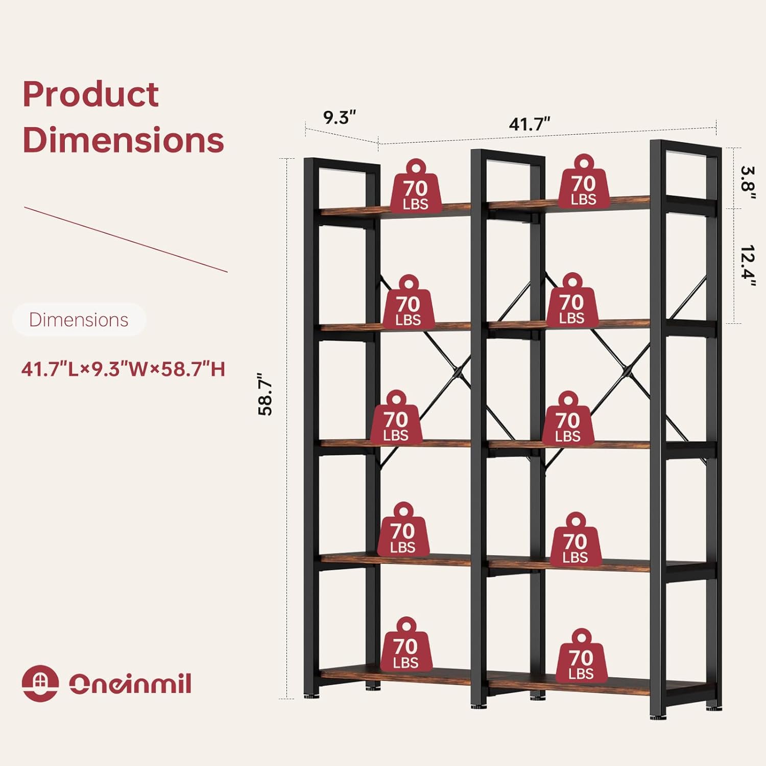 oneinmil 5 Tier Bookshelf Set of 2, 58.7'' Industrial Book Shelf, Wooden Bookshelves with 10 Open Display Shelves, Vintage Storage Rack, Standing Wide Bookcase for Home and Office, Rustic Brown
