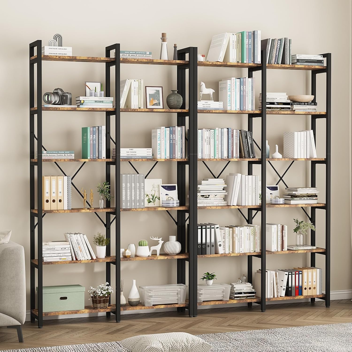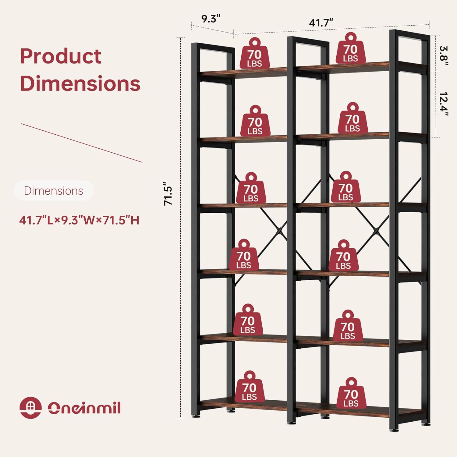 oneinmil 6 Tier Bookshelf Set of 2, 71.5'' Industrial Wood Bookshelves, Book Shelf with 12 Open Display Shelves & Metal Frame, Tall Bookcase for Home and Office, Rustic Brown