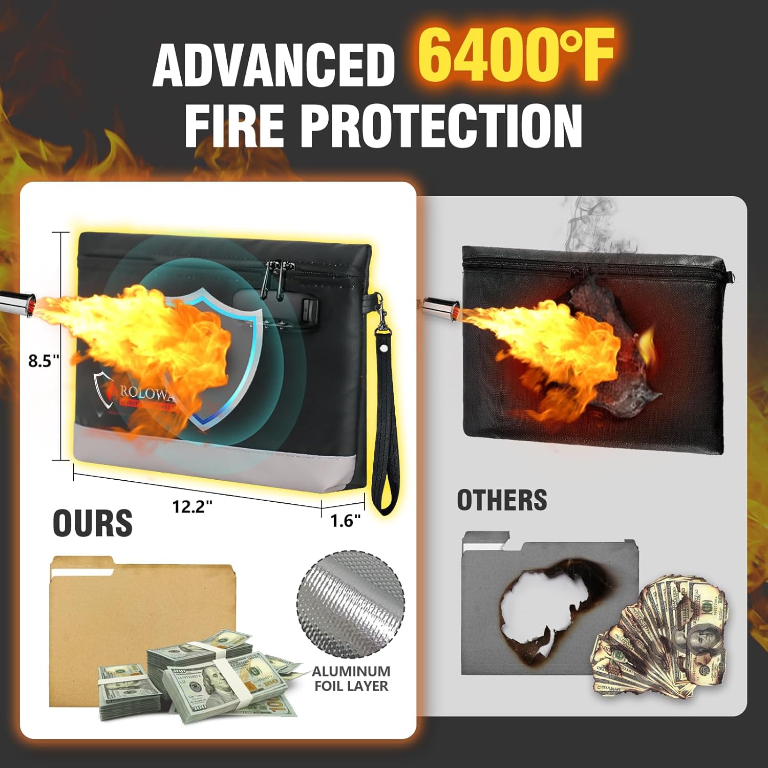 ROLOWAY Fireproof Money Bag with Lock for Cash, 6400°F Fire Proof Document Bag (12.2 x 8.5 x 1.6 inches), Money Pouch with Zipper (Black)
