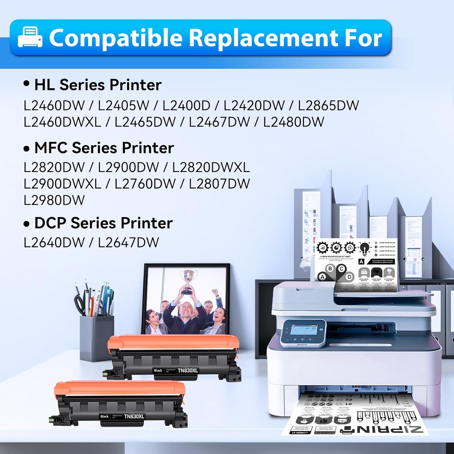 ZIPRINT TN830XL Toner 2 Pack(with chip) Compatible Replacement for Brother tn830 tn830xl tn830/xl/v tn-830xl Toner for HL-L2460DW DCP-L2640DW HL-L2405W MFC-L2820DW MFC-L2900DW HL-L2480DW Printer
