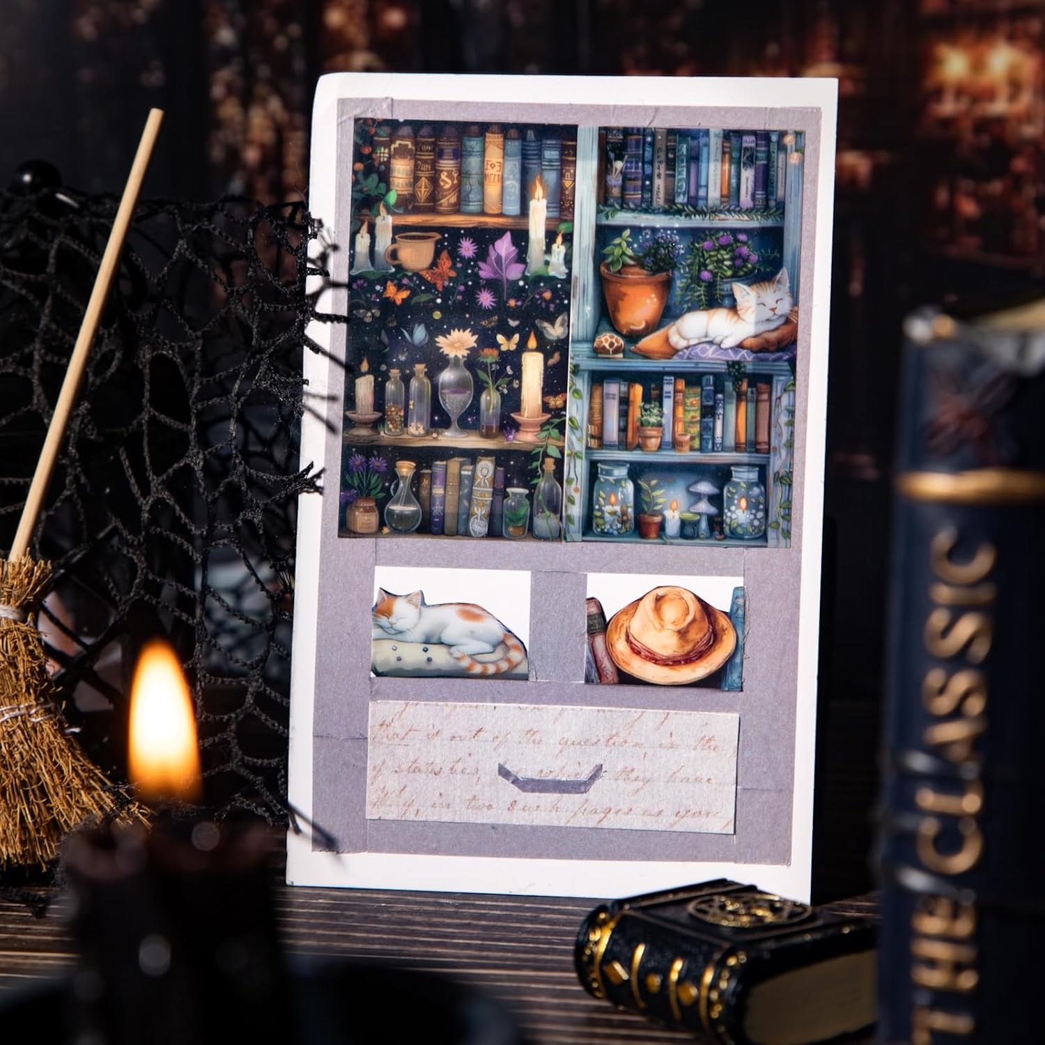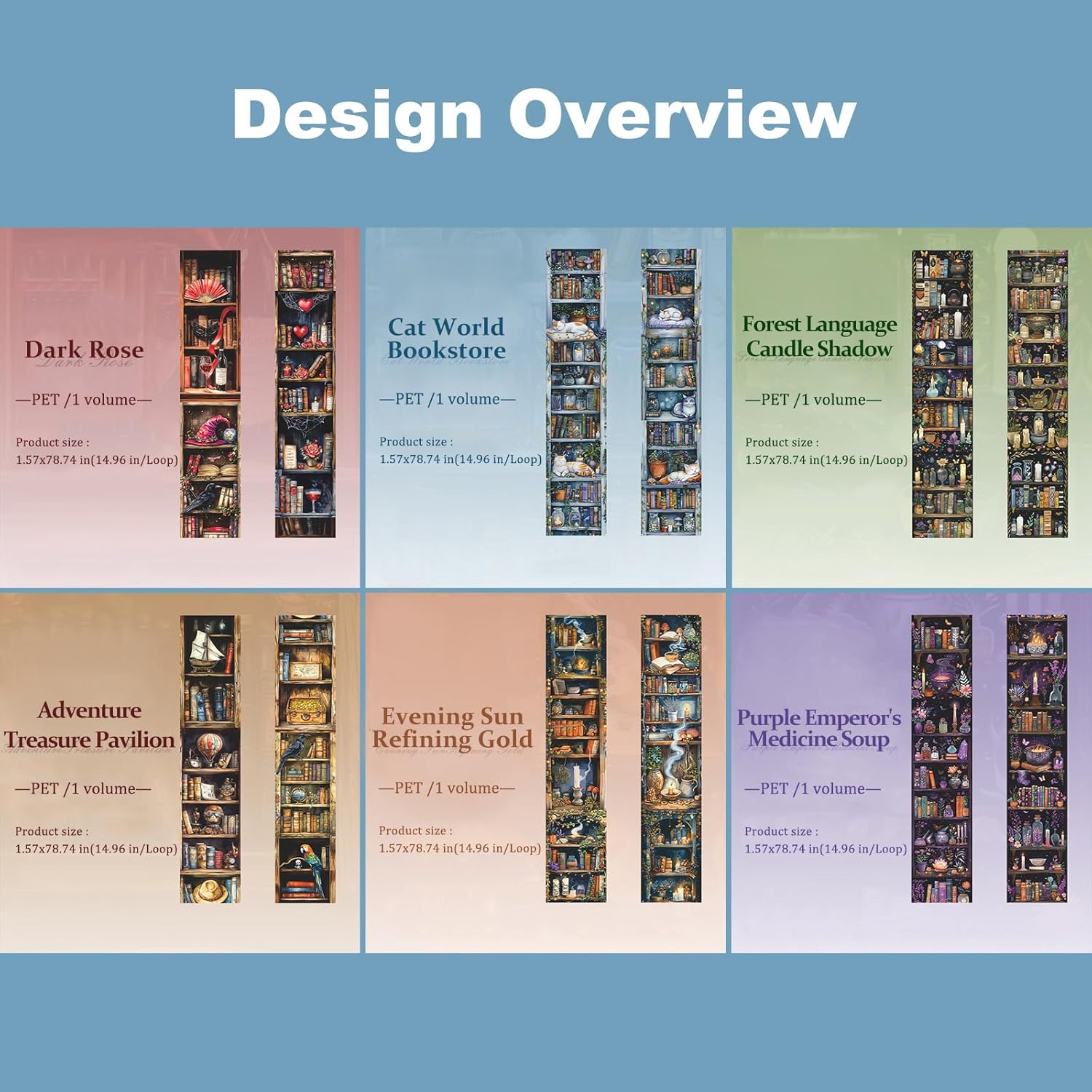 - Mystical Design and Size: This set includes 6 rolls of PET tape (1.57 inches wide × 78.74 inches long per loop), each adorned with dark magical bookshelf illustrations—featuring potion bottles, cats, books, and candles. The cohesive design style adds an enchanting, gothic atmosphere to any journal, scrapbook, or creative layout