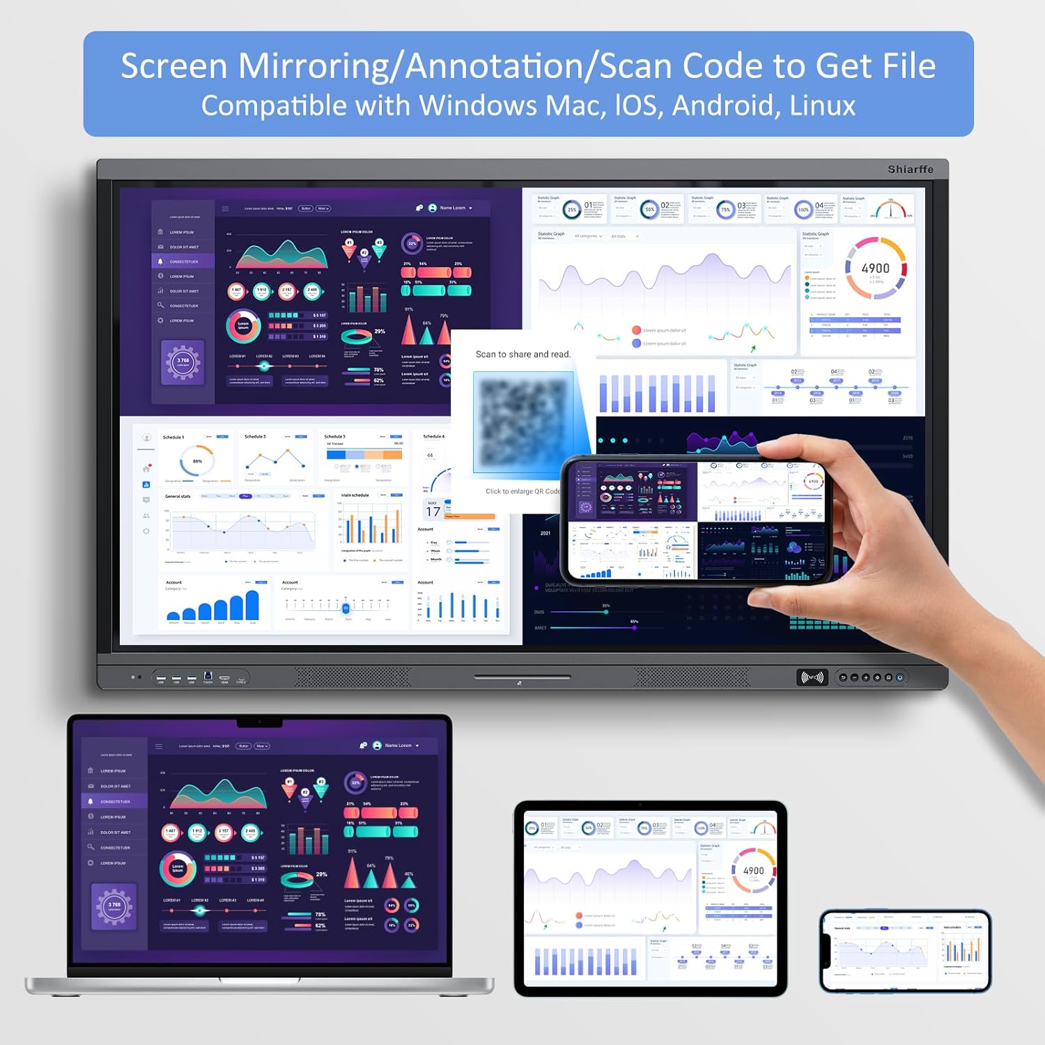 - Effortless Cross-Device Collaboration: Shiarffe smartboard turns any device into a collaboration tool. download E-Share on our PC or mobile device to mirror our screen, share files, and sync annotations across Android, iOS, Linux, Mac, and Windows