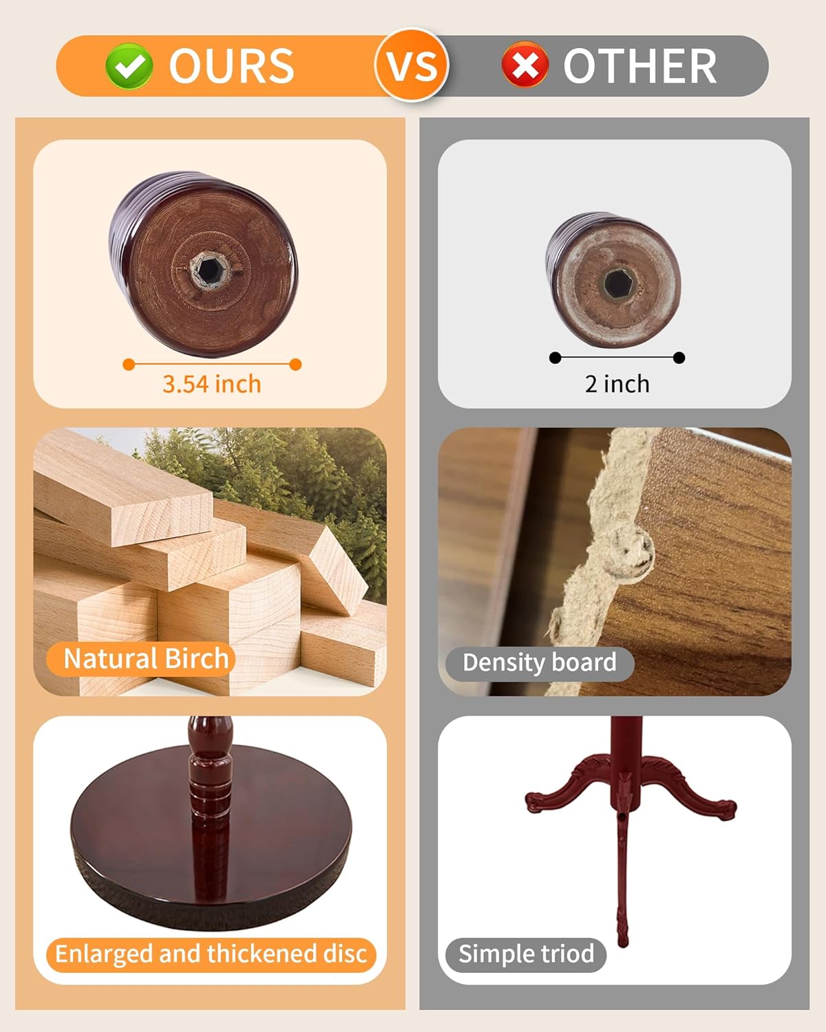 - THICKENED SOLID WOOD MAIN POLE: The coat rack stand main pole is made of 100% natural birch, with a diameter upgraded to 3.54 inches. The thickened and thickened design ensures that the structure is solid and does not shake. The wood coat tree stand can bear up to 180 pounds and can hang heavy coats and down jackets for a long time without deformation. The coat hanger stand durability is far superior to ordinary board coat racks, providing a reliable storage solution for modern families