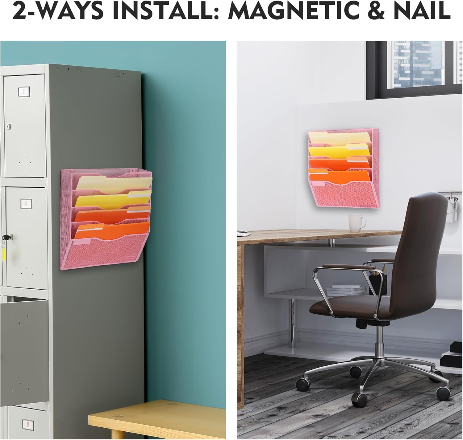 EASEPRES Magnetic 5 Pocket Mesh Hanging File Organizer, Wall Mounted Mail Paper Document Folder Holder, Clipboard Storage Organization Magazine Rack with Nametag Label for Office Home School, Pink