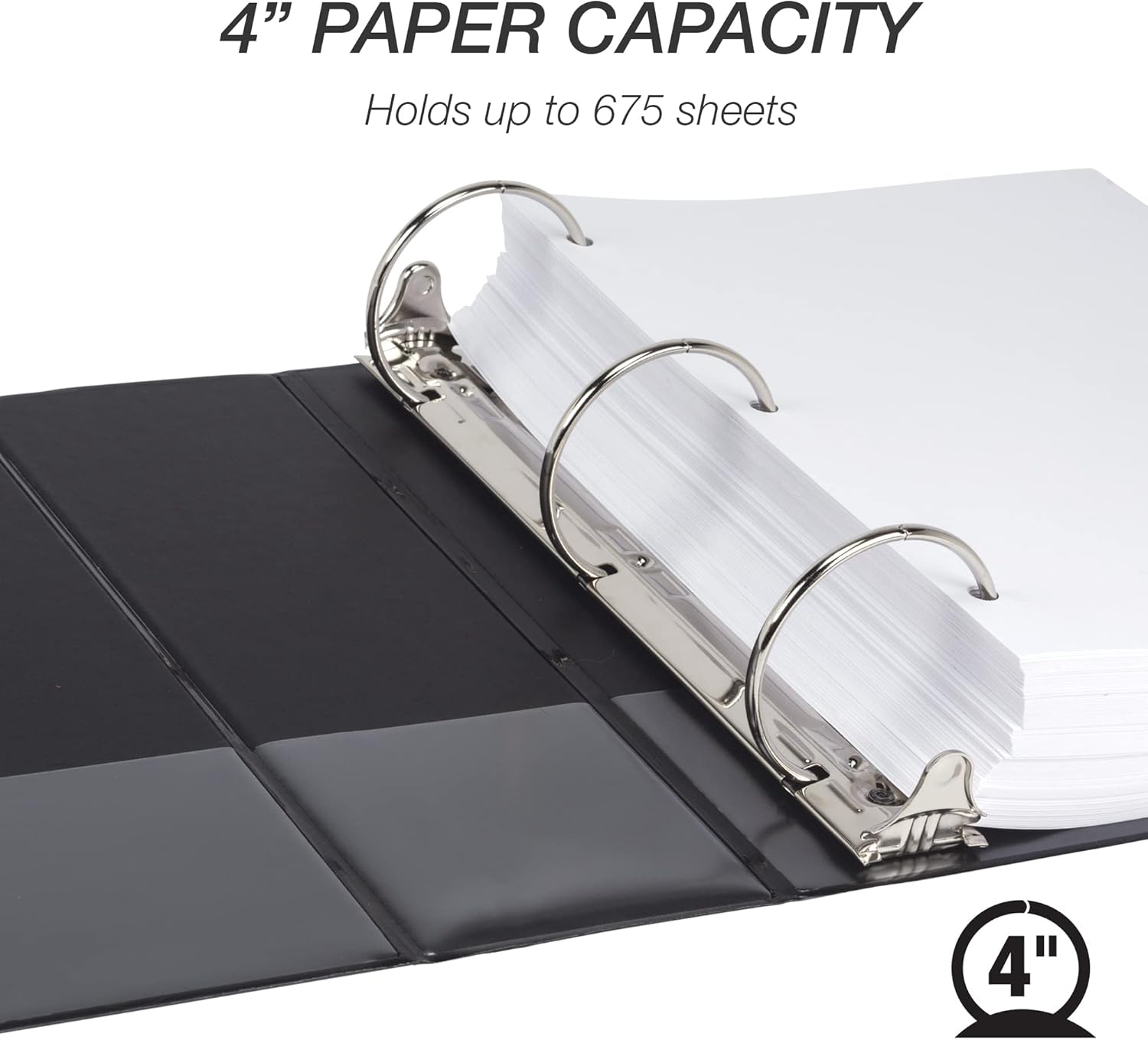 - 3-Ring Binder for Light-Duty Use: Ideal for classrooms, home offices, and professional workspaces, these 4 inch 3-ring binders hold up to 675 sheets of standard 8.5" x 11" paper. The round ring design allows for smooth page turning and reliable performance. Two clear interior pockets make them perfect for organizing documents, schoolwork, or everyday office tasks on budget