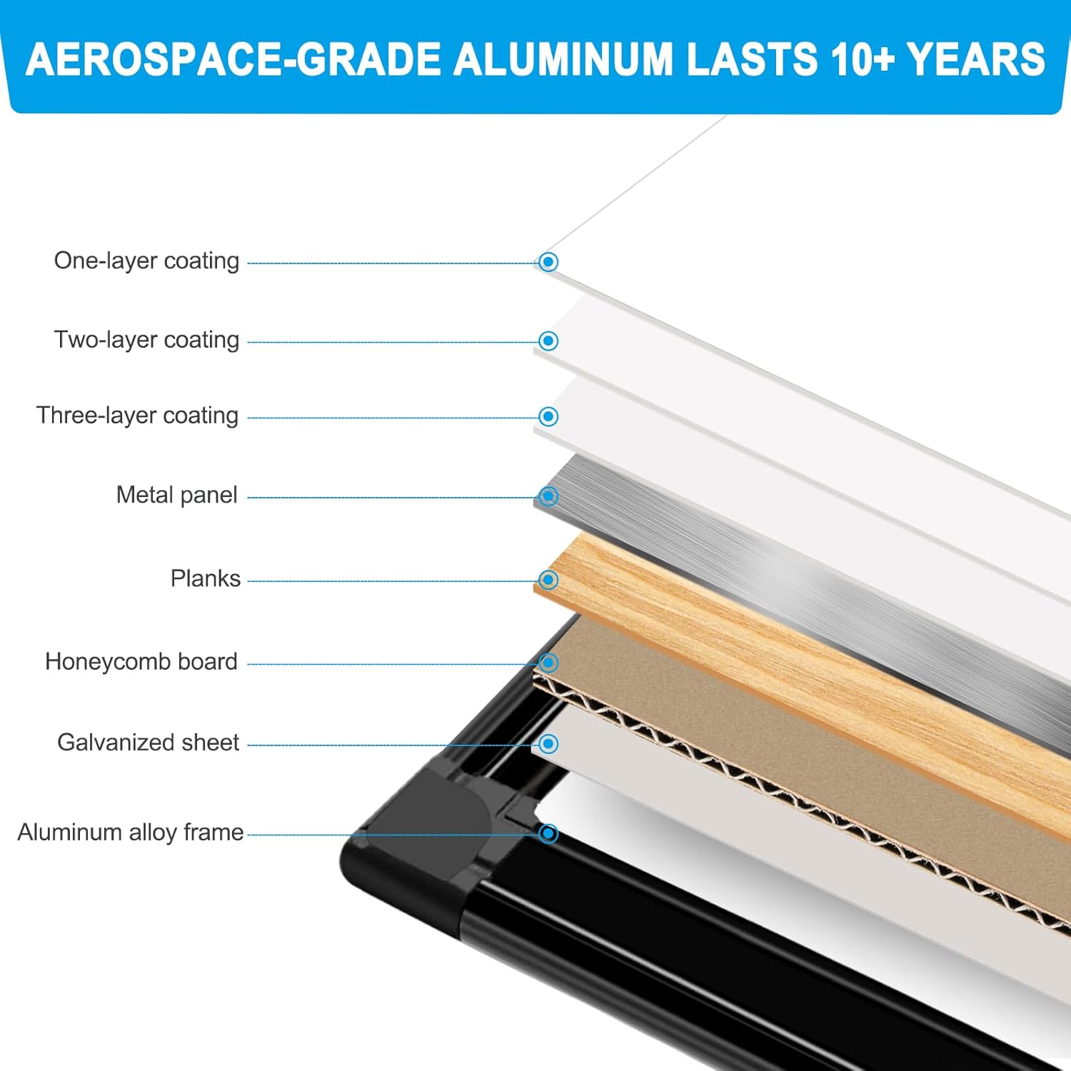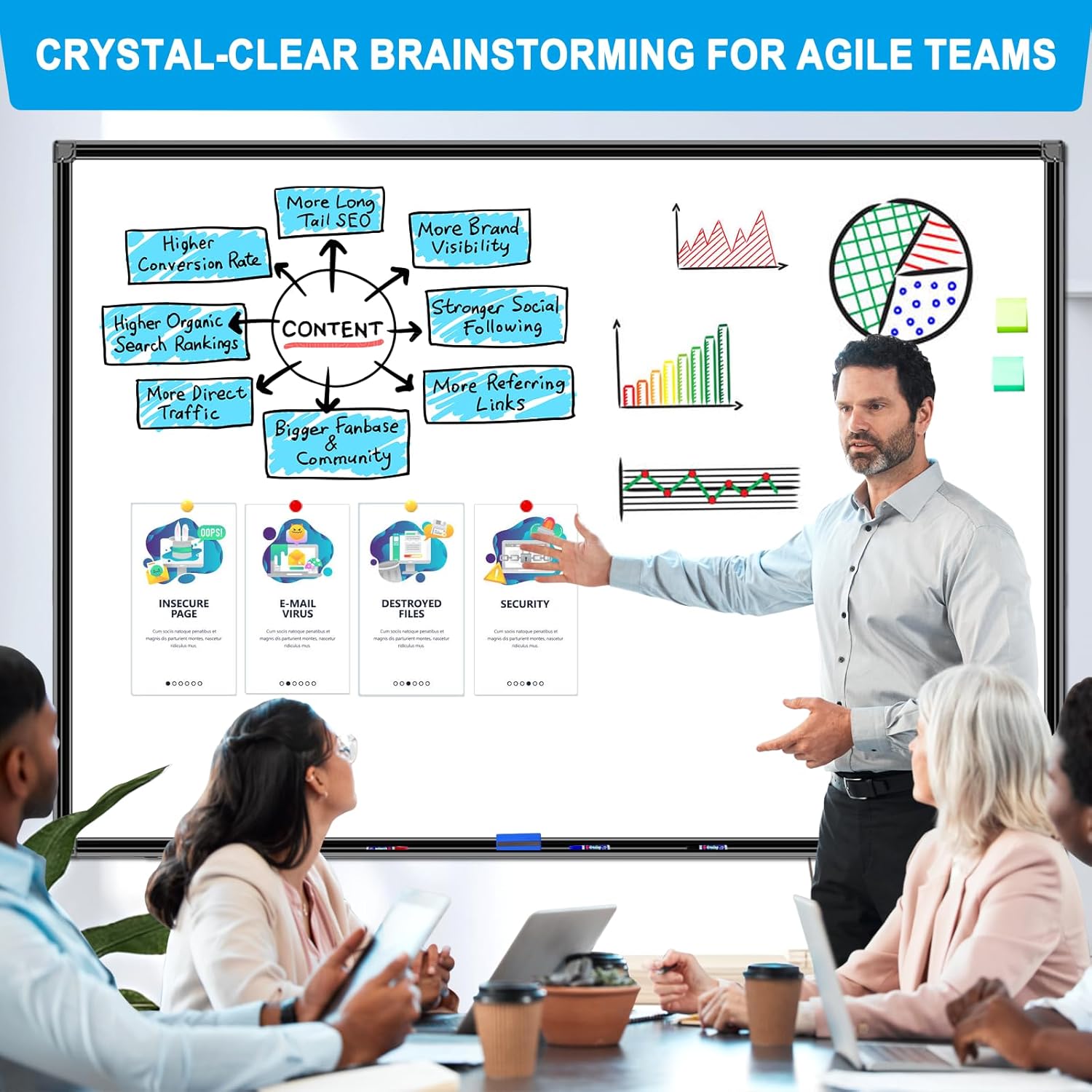 - ✔ Premium Durability – Unlike flimsy cardboard-core whiteboards, our sturdy wooden core resists warping, dents, and creases for long-lasting use. Black aluminum frame with ABS corner guards prevents dings.