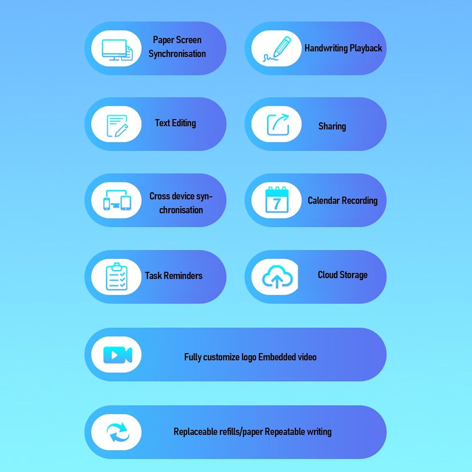 - Playback and Sharing: The smart digital pen supports saving and playing back content in video format. This feature allows you to review your creative and learning processes. Additionally, you can easily share your notes or creations via email or other social media platforms in PDF or image formats.