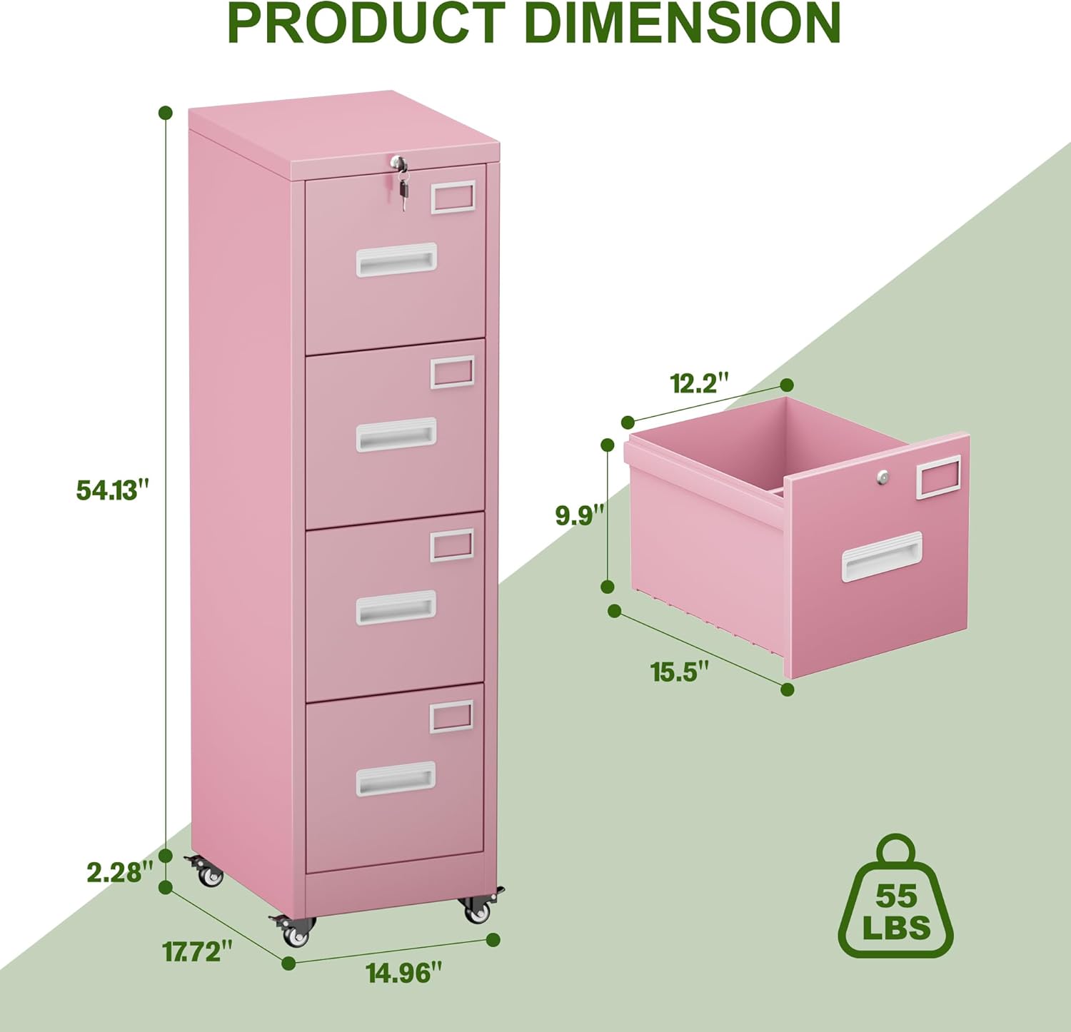 Aobabo File Cabinet 4 Drawer with Wheels, Lockable Office Metal Filing Cabinet with Name Card for Office and Home,Assembly Required,Pink