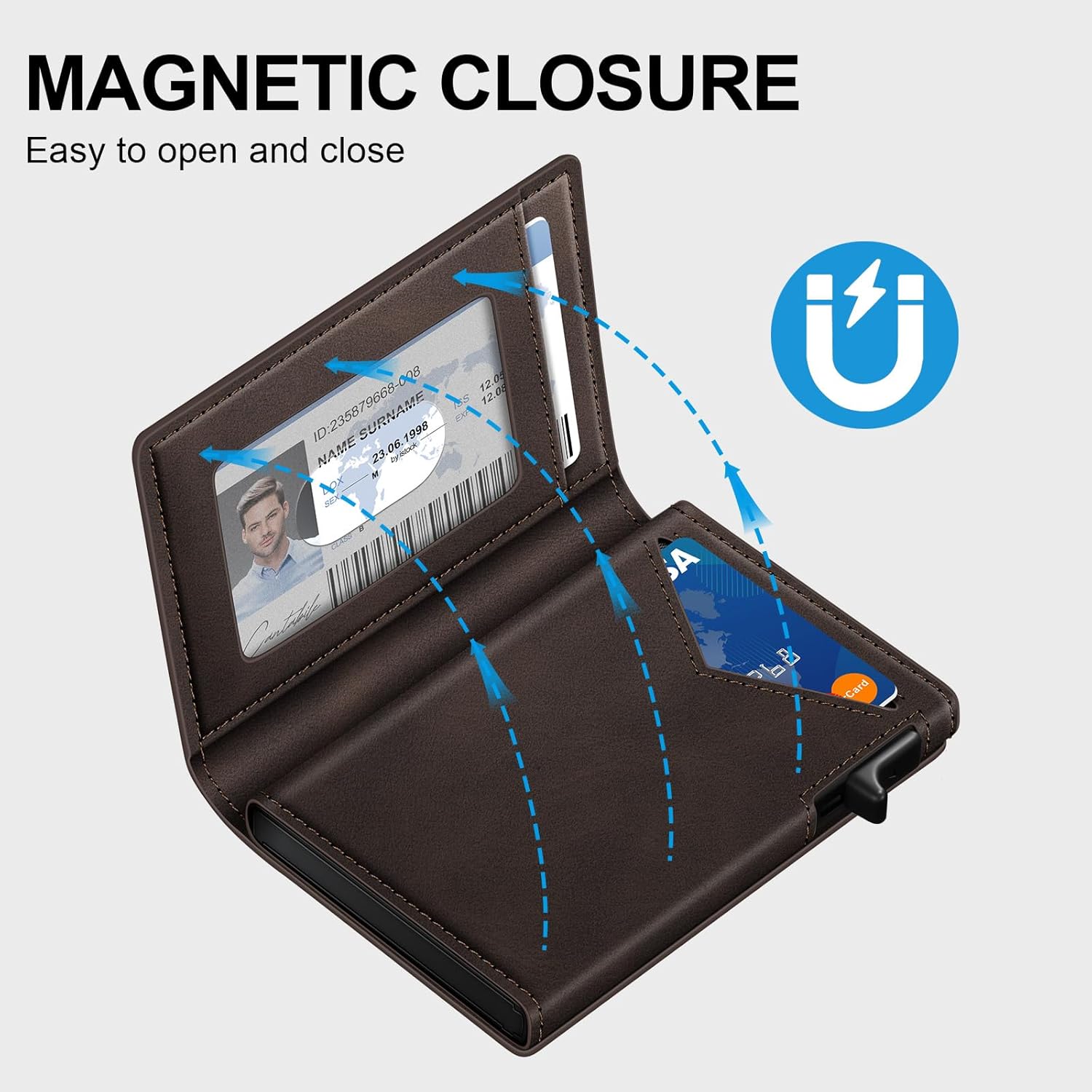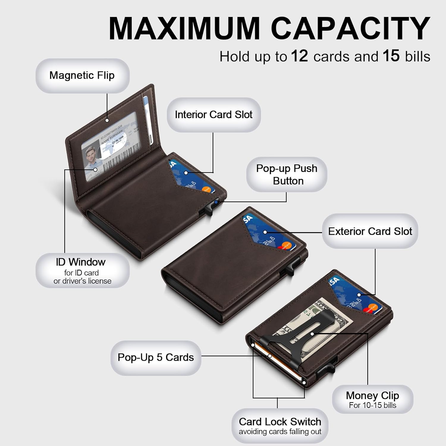 Wallet for Men, RFID Wallet with Money Clip & ID Window, Minimalist Pop Up Credit Card Case Holder 10-12 Cards, Bifold Slim Smart Wallet for Front Pocket, Compact Metal Wallets, Gifts for Men, Coffee