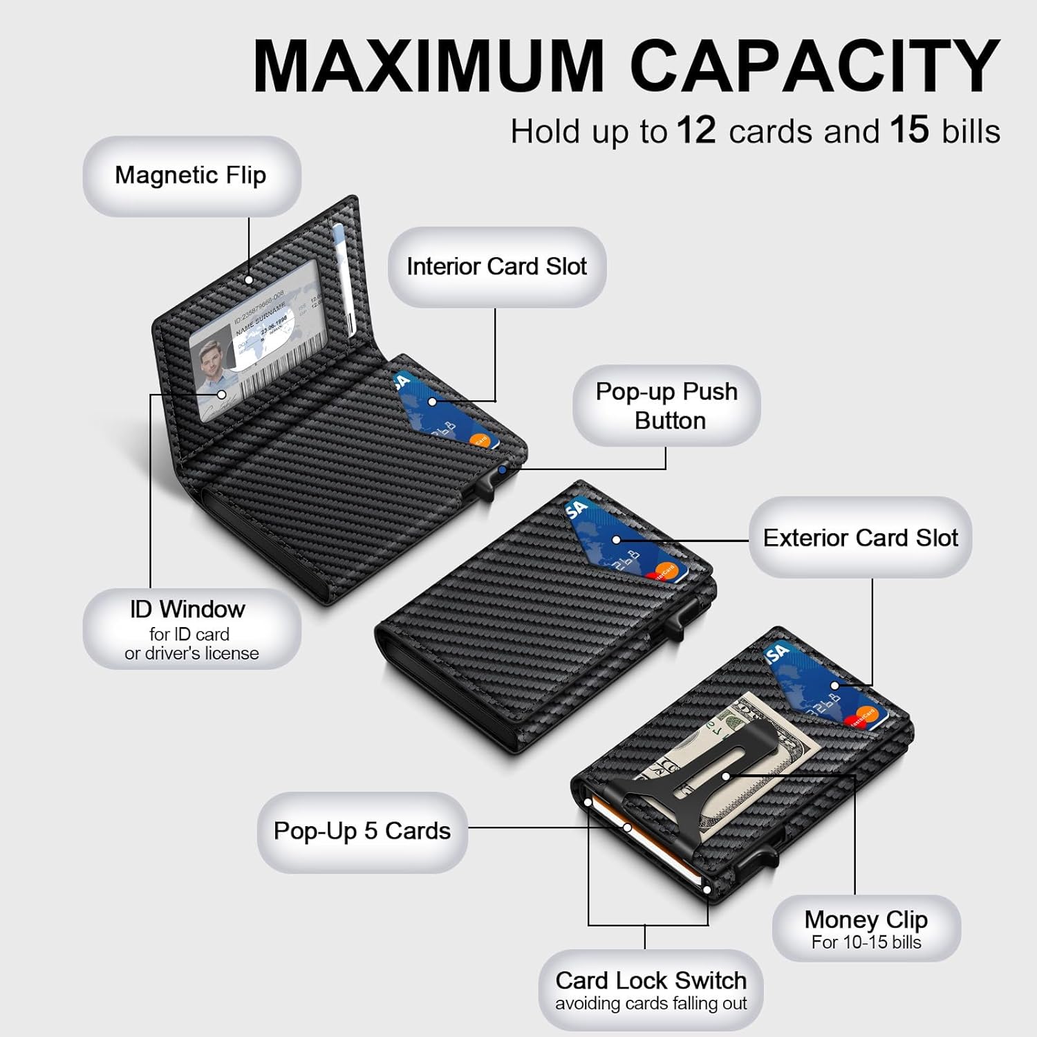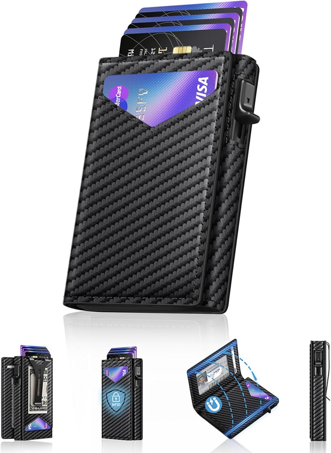 Wallet for Men, RFID Wallet with Money Clip & ID Window, Minimalist Pop Up Credit Card Case Holder 10-12 Cards, Bifold Slim Smart Wallet for Front Pocket, Compact Metal Wallets, Gifts for Men, Carbon