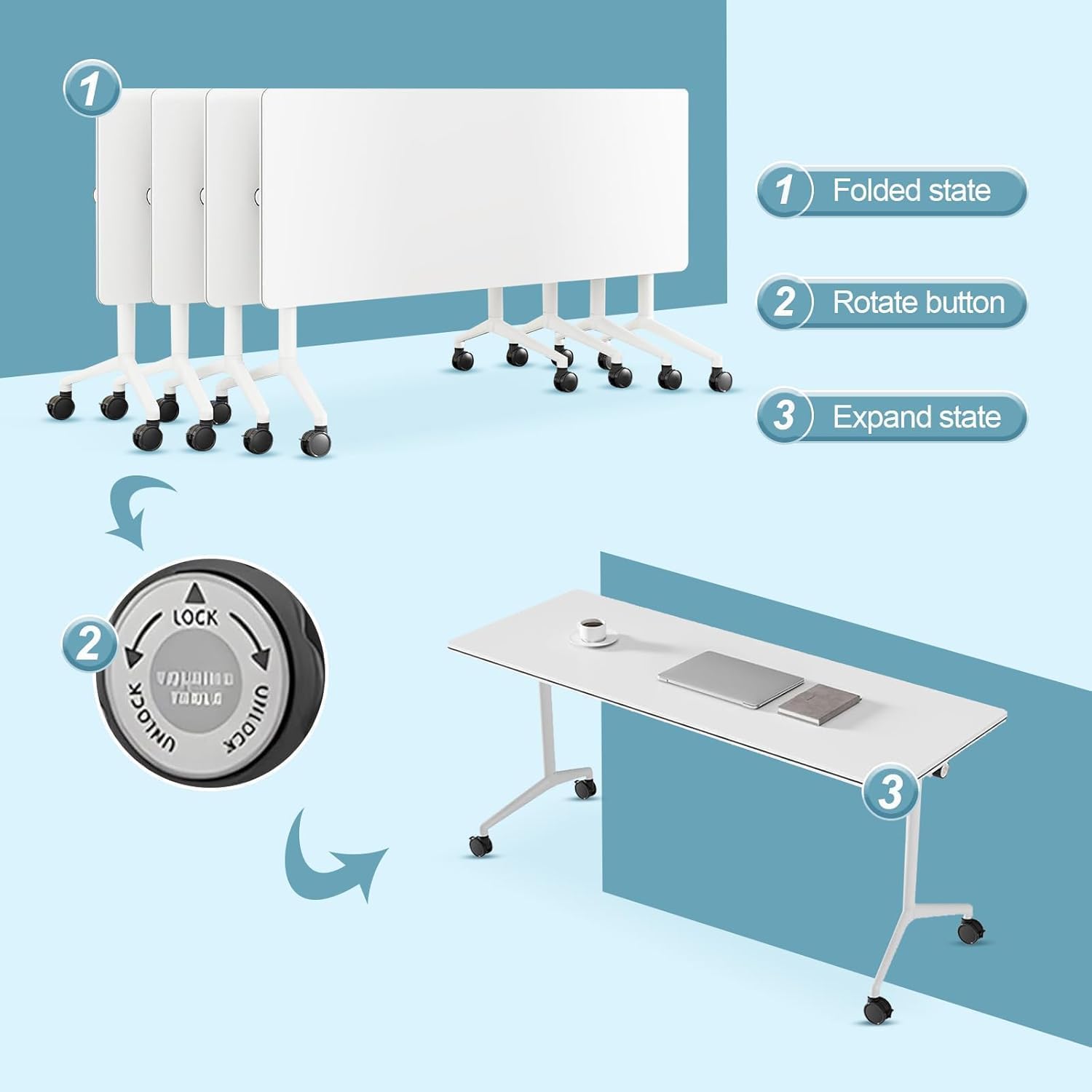 - ✅【ONE-CLICK FOLDING CONFERENCE TABLE】 Group room tables are an excellent choice for conference rooms, reception rooms and training rooms. Just turn the knob and the table can be easily flipped, saving a lot of space and making it easy to store and carry.