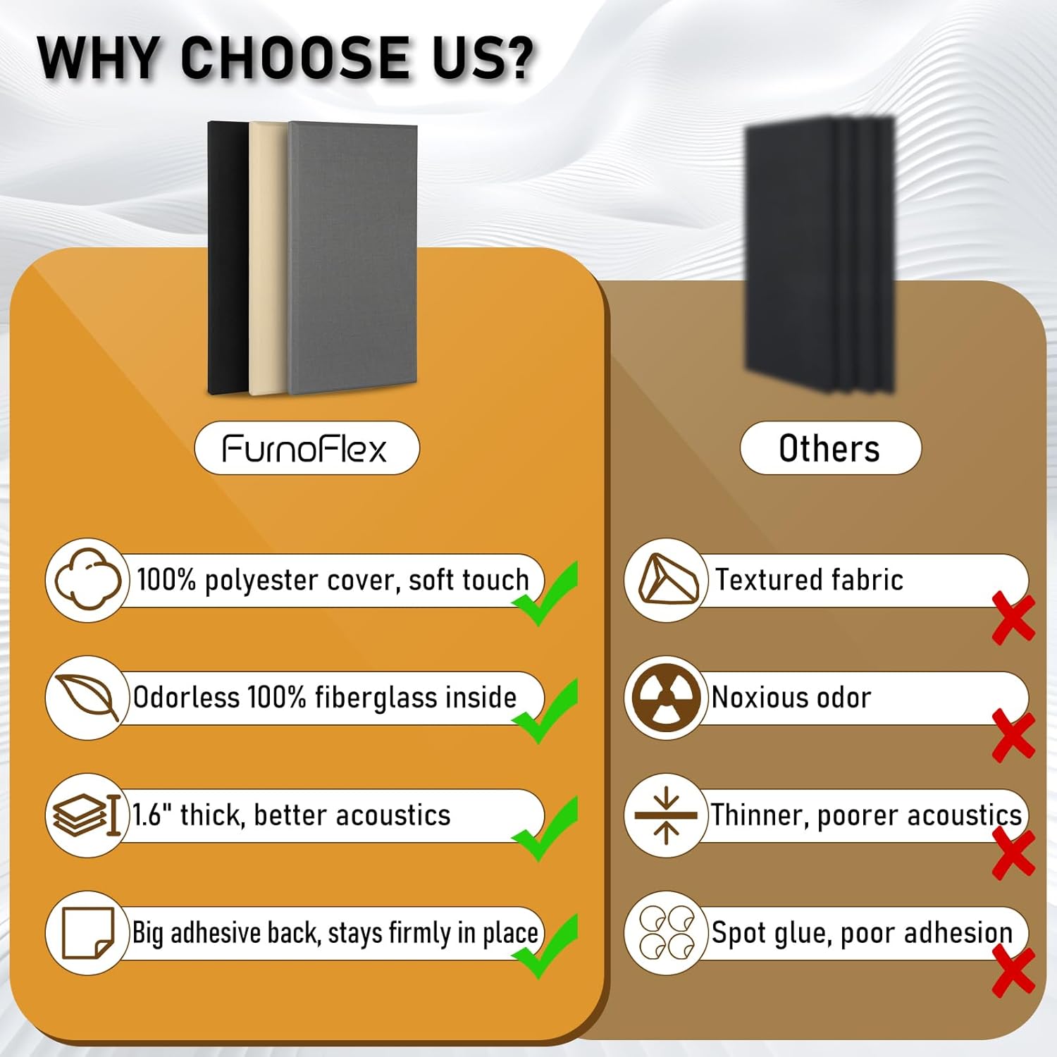 - 【Superior Sound Absorption】FurnoFlex panels feature high-density fiberglass and polyester fabric to reduce noise, echoes, and reverberation, with an absorption frequency range of 150-20000Hz, enhancing clarity and comfort in your sound environment.