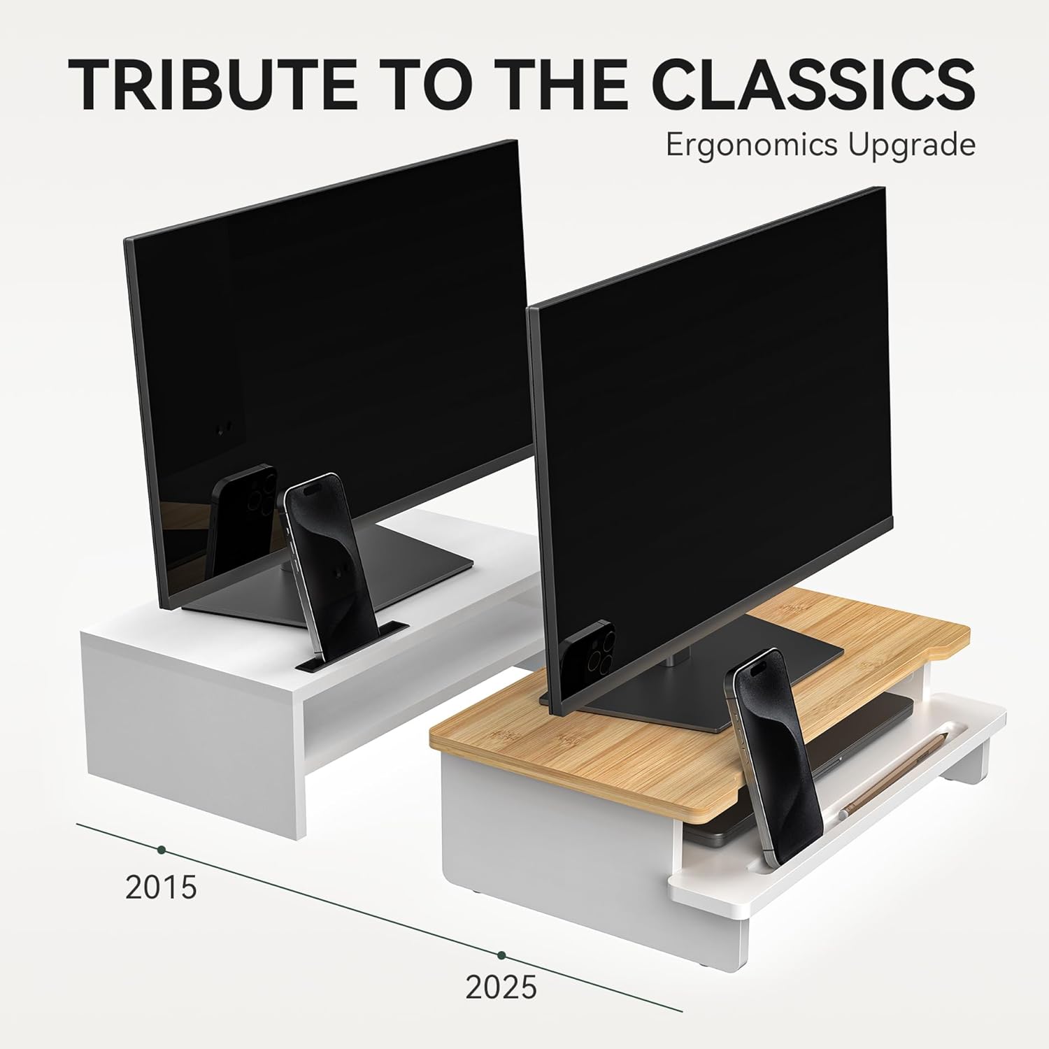 Monitor Stand Monitor Stand Riser for Desk,Wood Desk Shelf Storage Organizer with Phone Tablet Holder (16.5 Inch, White & Natural Bamboo)