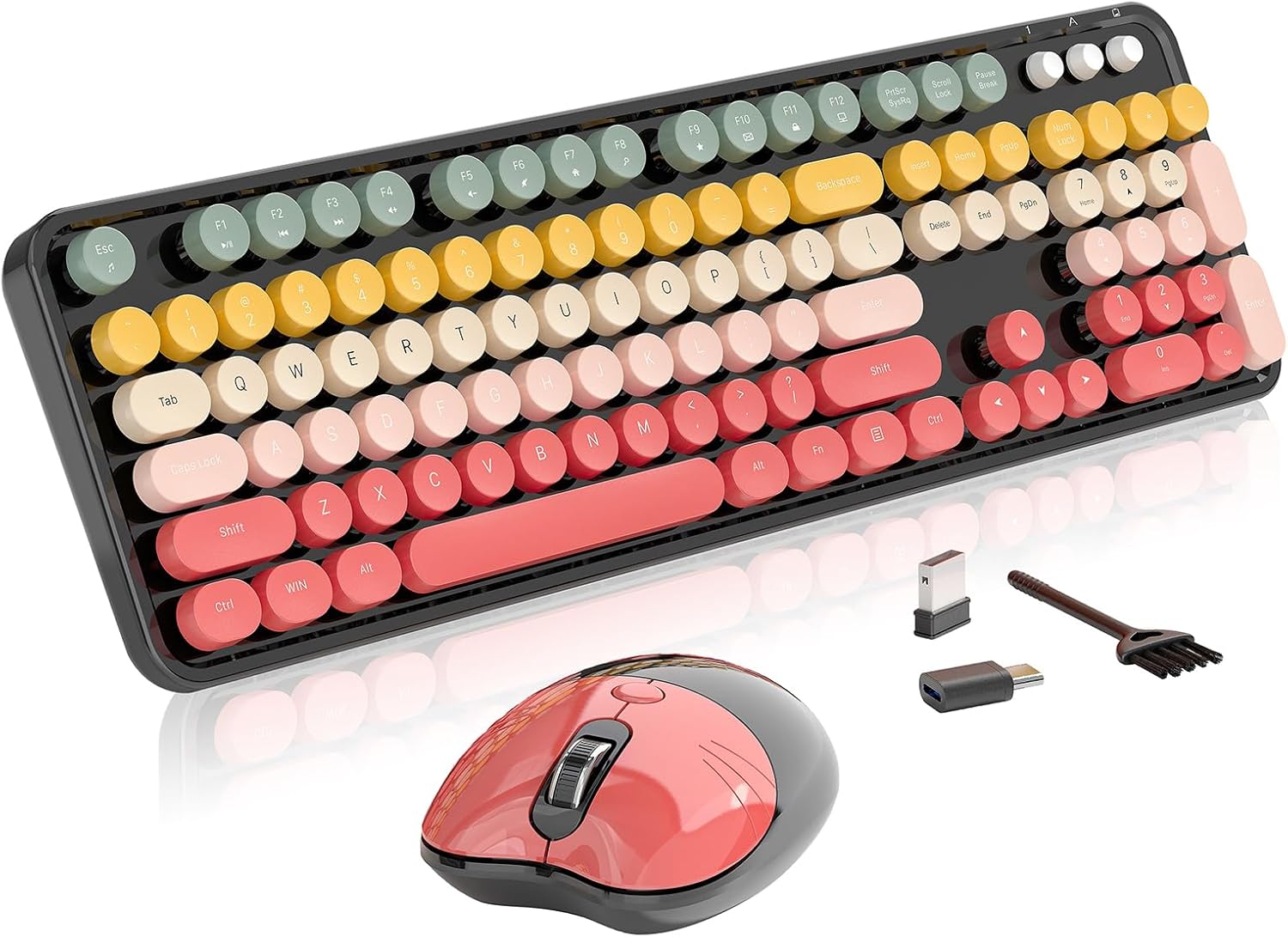 - 🌙 RETRO WIRELESS KEYBOARD AND MOUSE SET This typewriter keyboard features a vintage design with iconic round keycaps. The wireless keyboard and mouse combo is reliable and ideal for home, office, or college. Free replacement for damaged receiver.