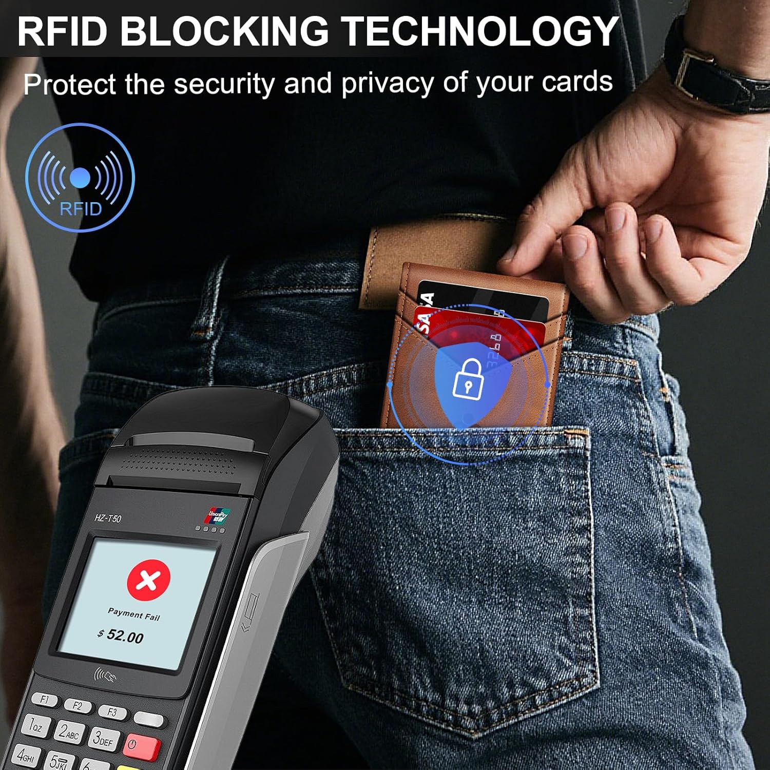 - RFID BLOCKING: The rfid wallet for men is lined with RFID-blocking fabric inside the leather layers. This protects your personal and financial information from unauthorized scans.