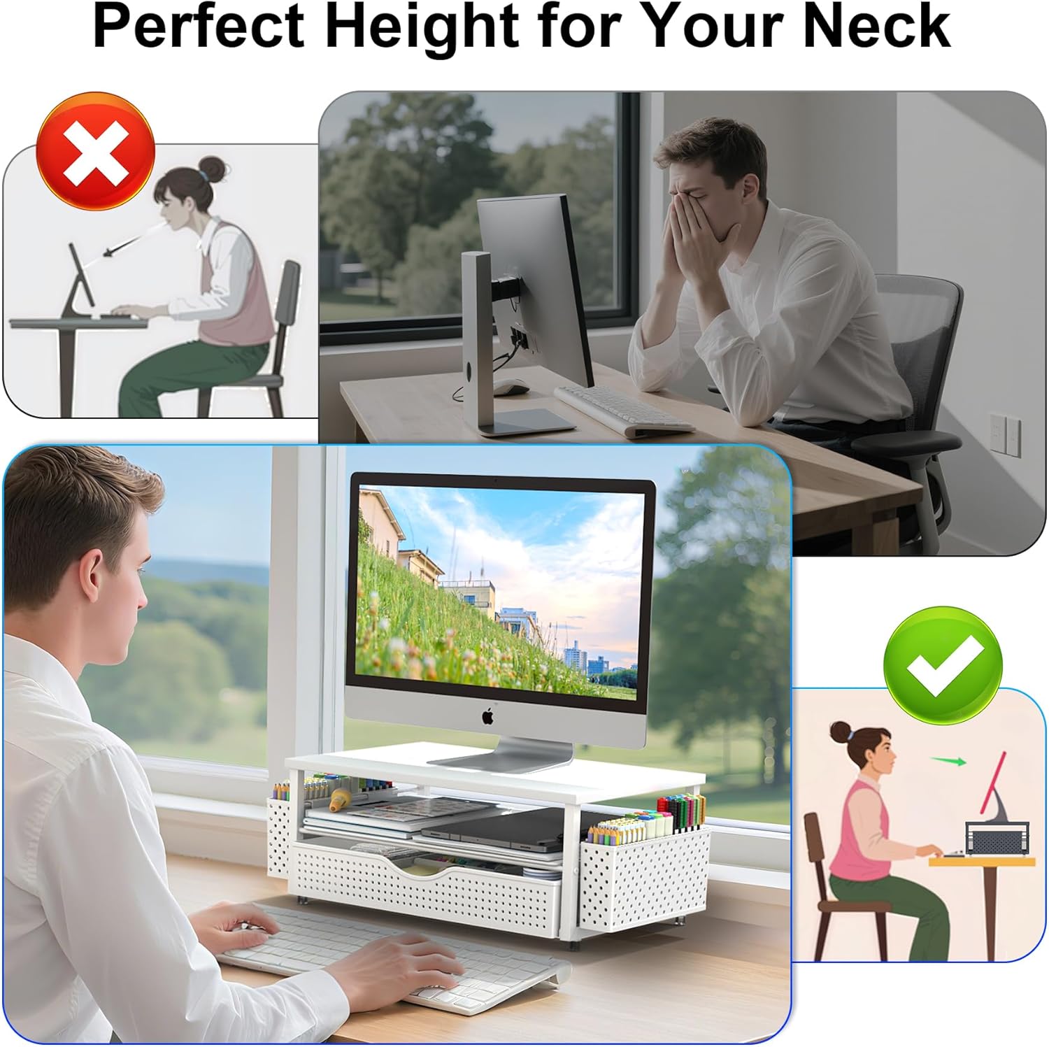 - Ergonomic design: Raise the monitor to eye level for the most comfortable viewing experience, relieve your neck, back, waist, help you develop a good posture and provide a neat workspace.experience.