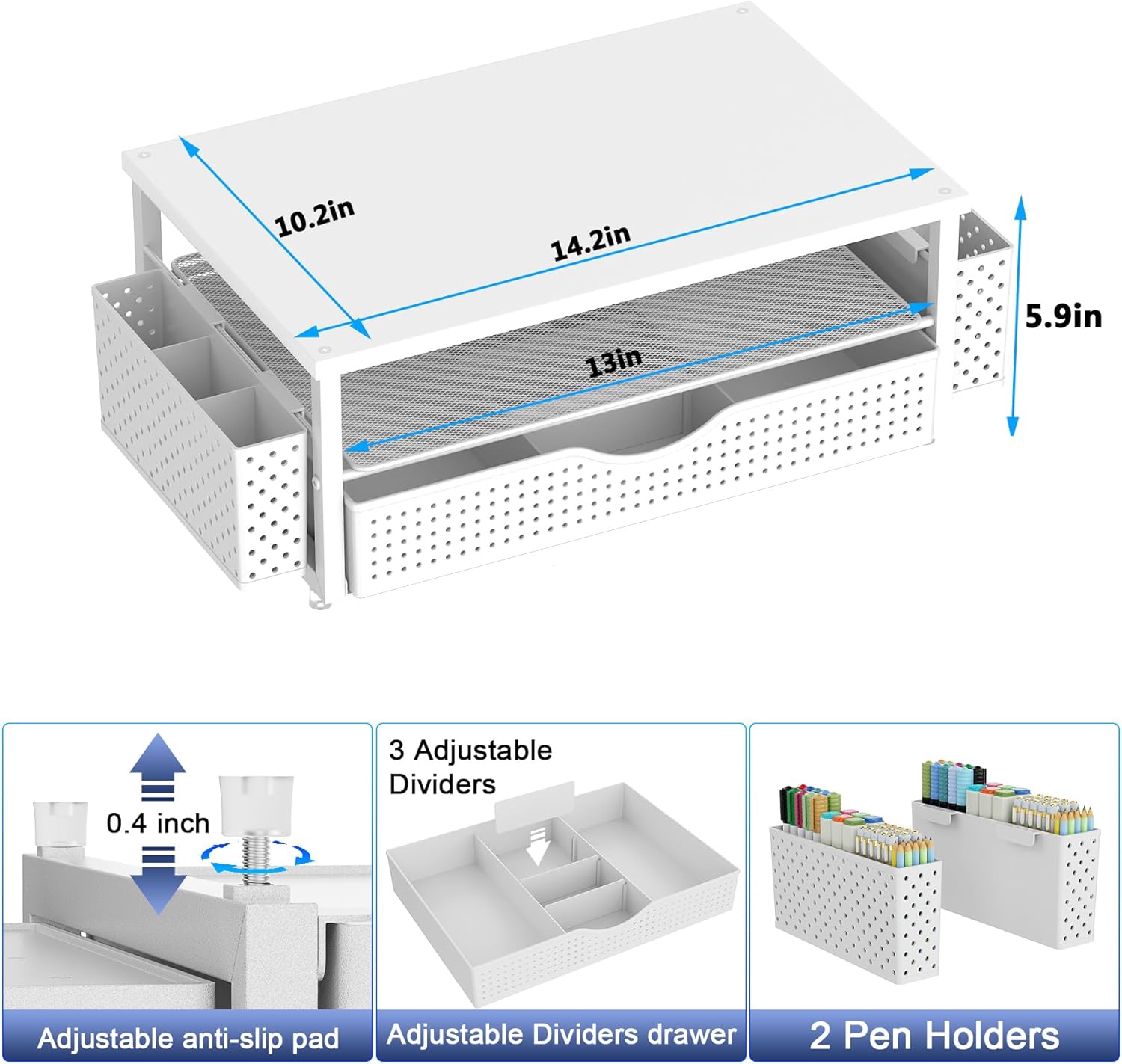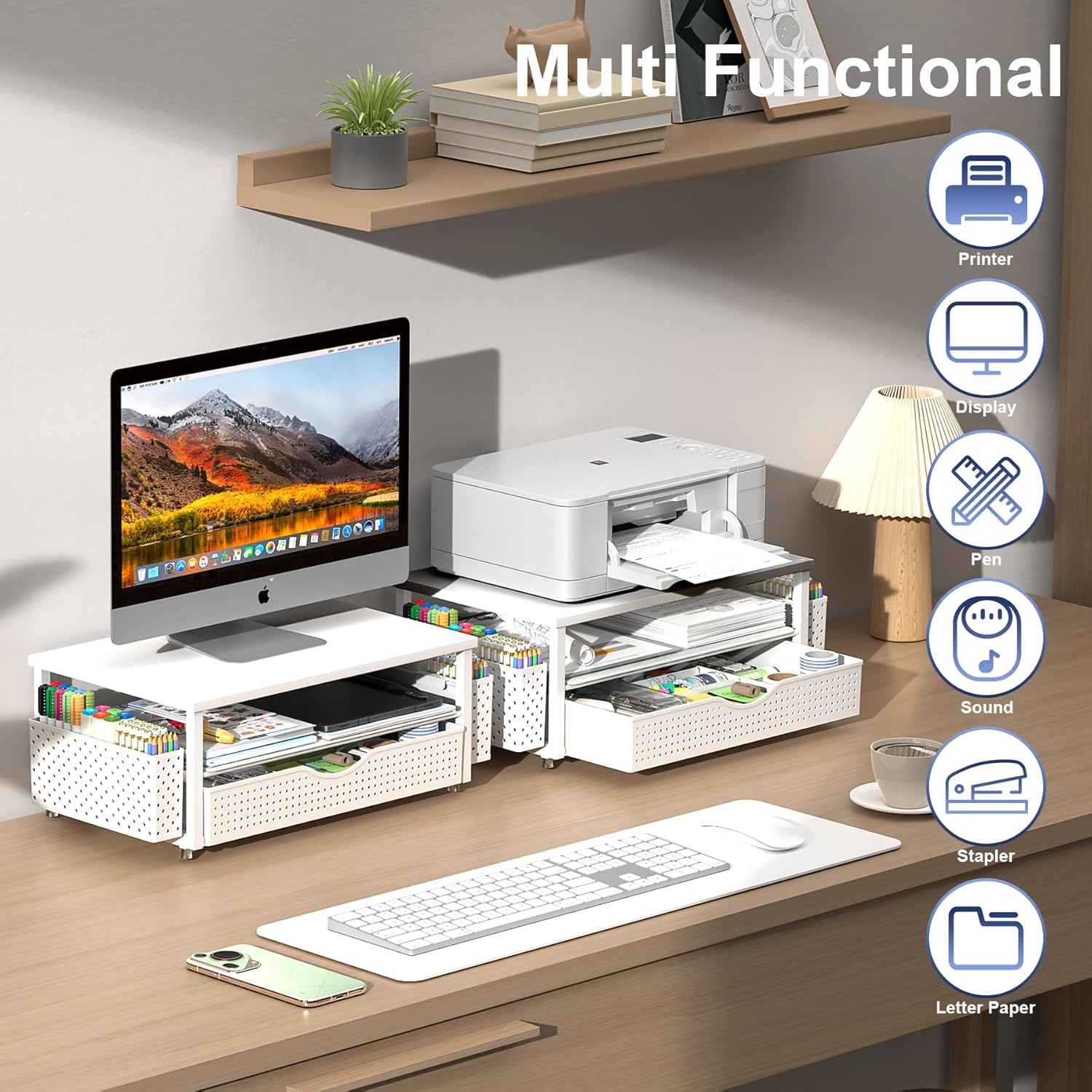 - Space saving: Utilize the open space under the monitor to create the largest possible storage space, provide storage space for various office items, and help keep supplies organized and improve work efficiency