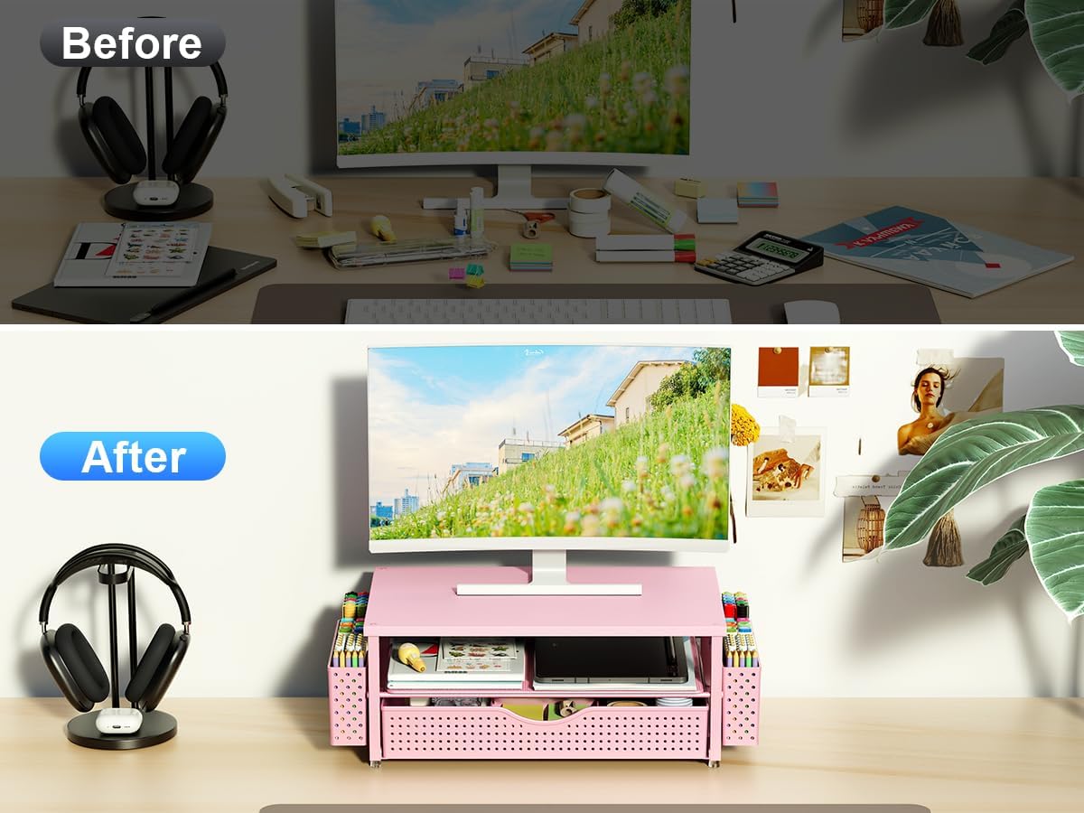 - Space saving: Utilize the open space under the monitor to create the largest possible storage space, provide storage space for various office items, and help keep supplies organized and improve work efficiency