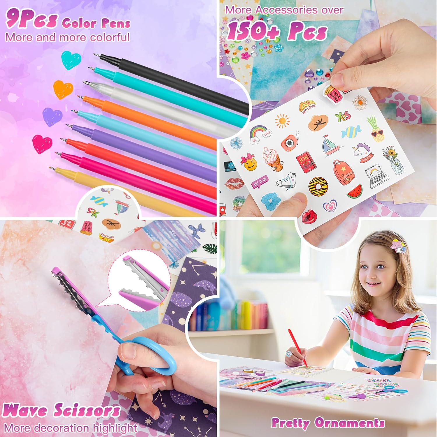 - [Unique Design]-This scrapbook kit comes with 9 vibrant color pens for colorful writing and doodles, wave scissors that add fun edges to pages, and over 150 accessories—including pattern stickers, shiny gems, and cute ornaments—perfect for decorating and customizing every corner of the journal.