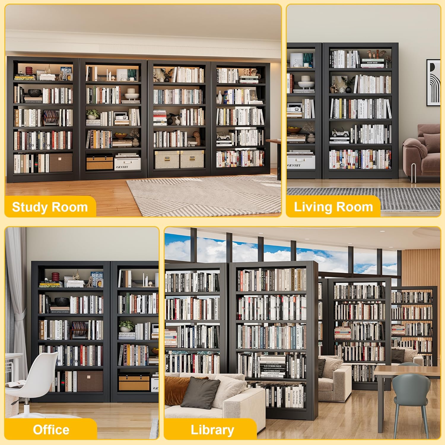 - Book Case Safety & Stability Features: Modern bookshelf includes anti-tip hardware that meets US safety standards. Rounded corners prevent injuries, steel shelves with bookends keep items secure. The 36" wide base provides exceptional stability for this tall storage unit.