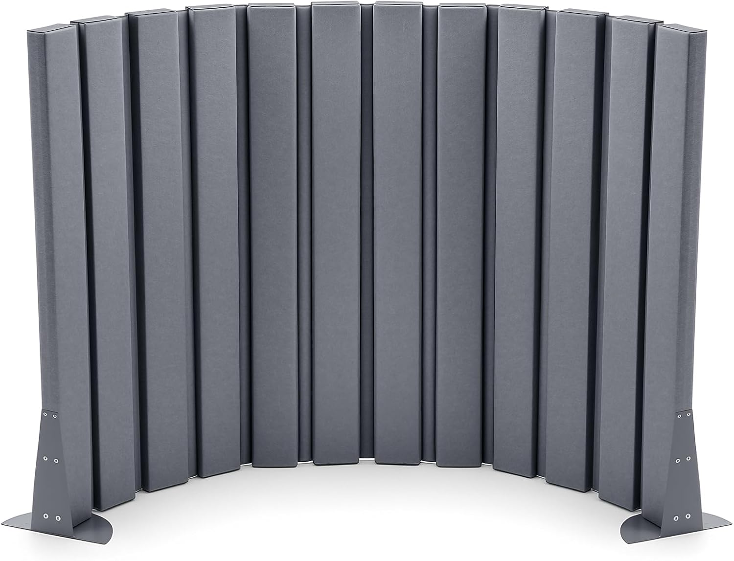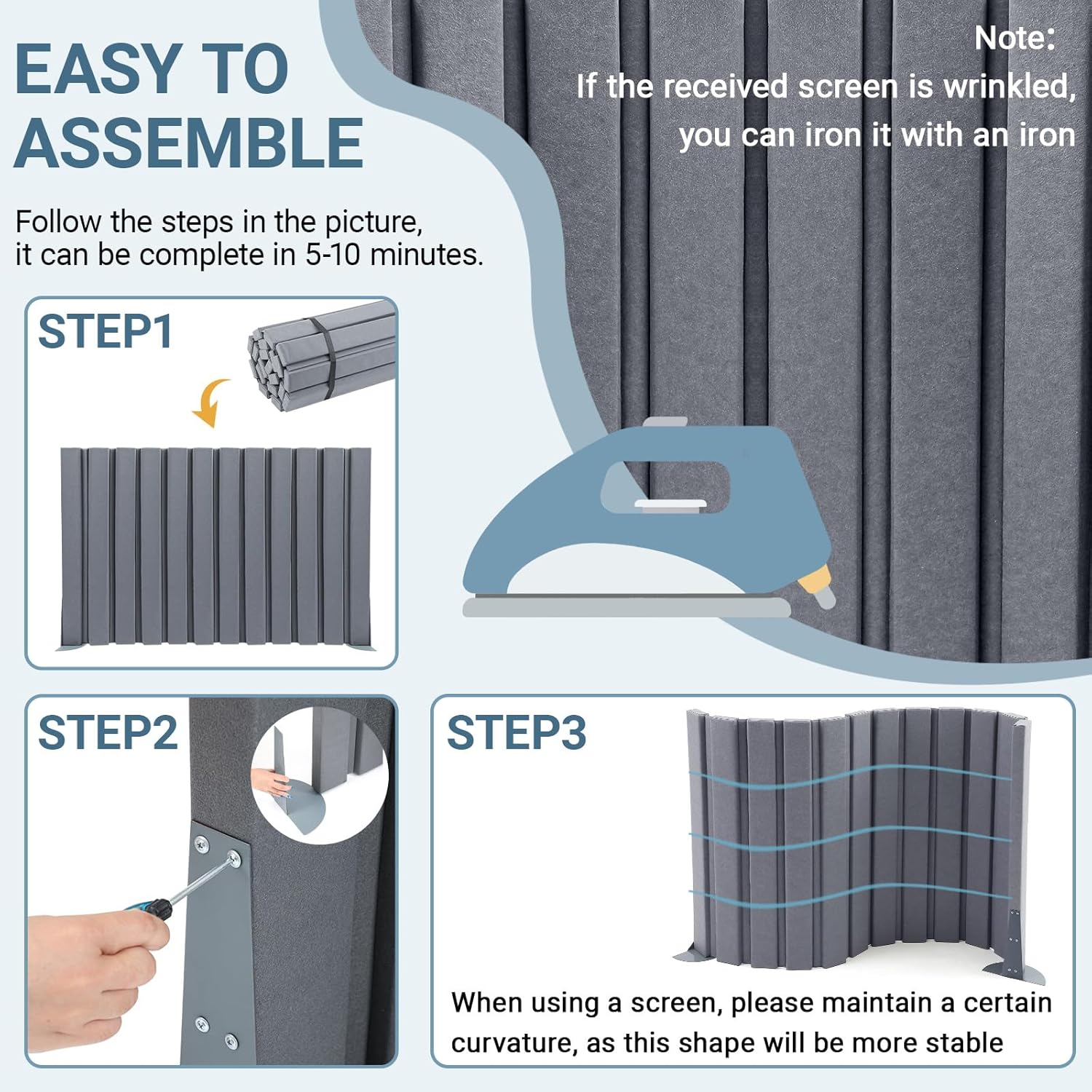 - Easy Assembly & Storage: this partition wall stands on its own and folds into various shapes as needed; The acoustic room divider can be rolled up and stored when not in use; Setup takes quickly, just attach the included curved legs, and your soundproof panel is ready to use