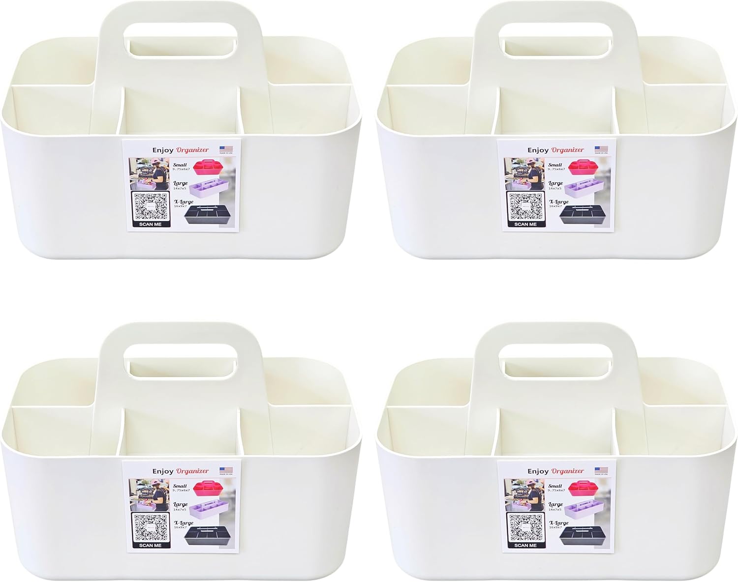 Small Stackable Plastic Caddy with Handle 6 Compartment | Desk, Makeup, Dorm Caddy, Classroom Art Organizers - 4 Pack, Made In USA (Ivory)