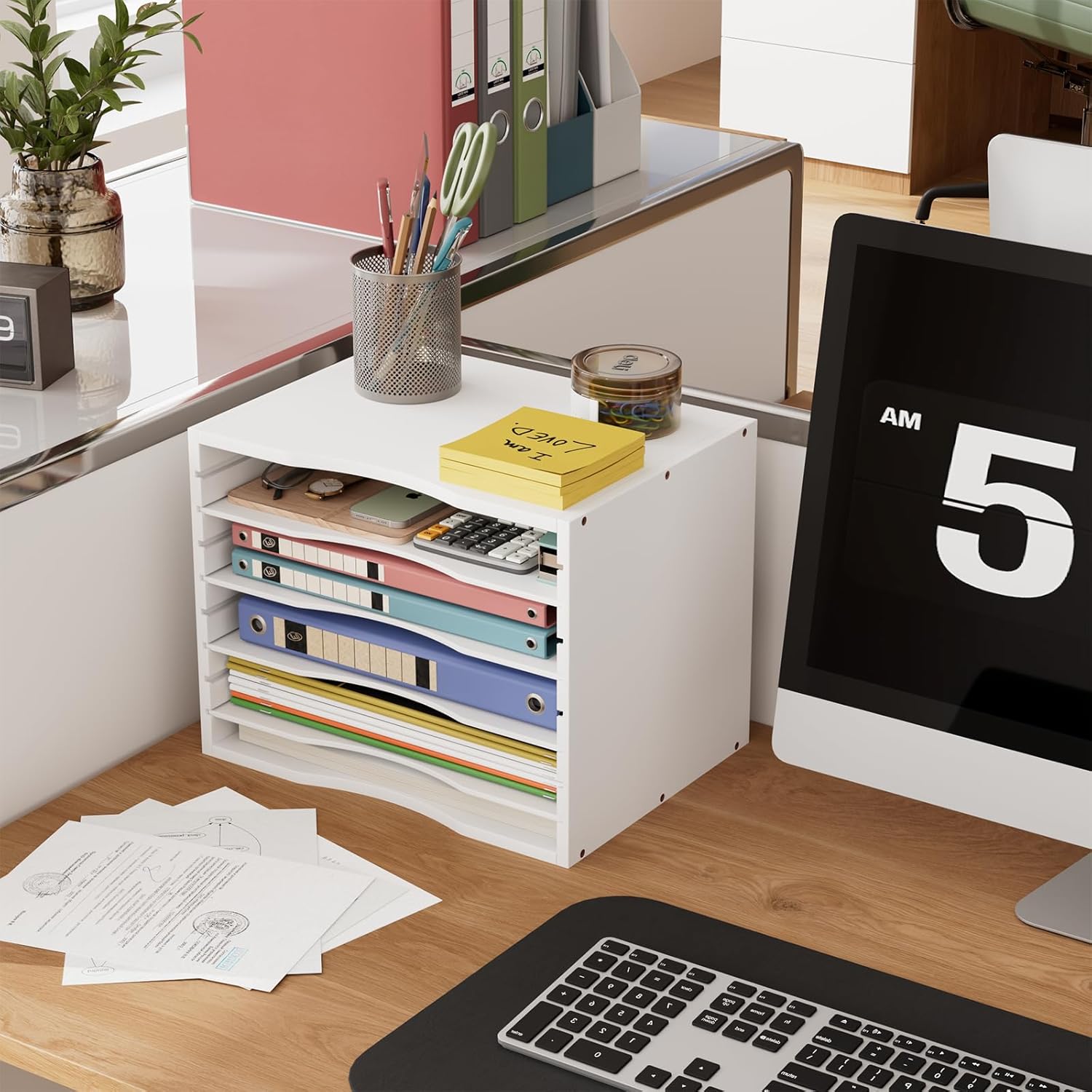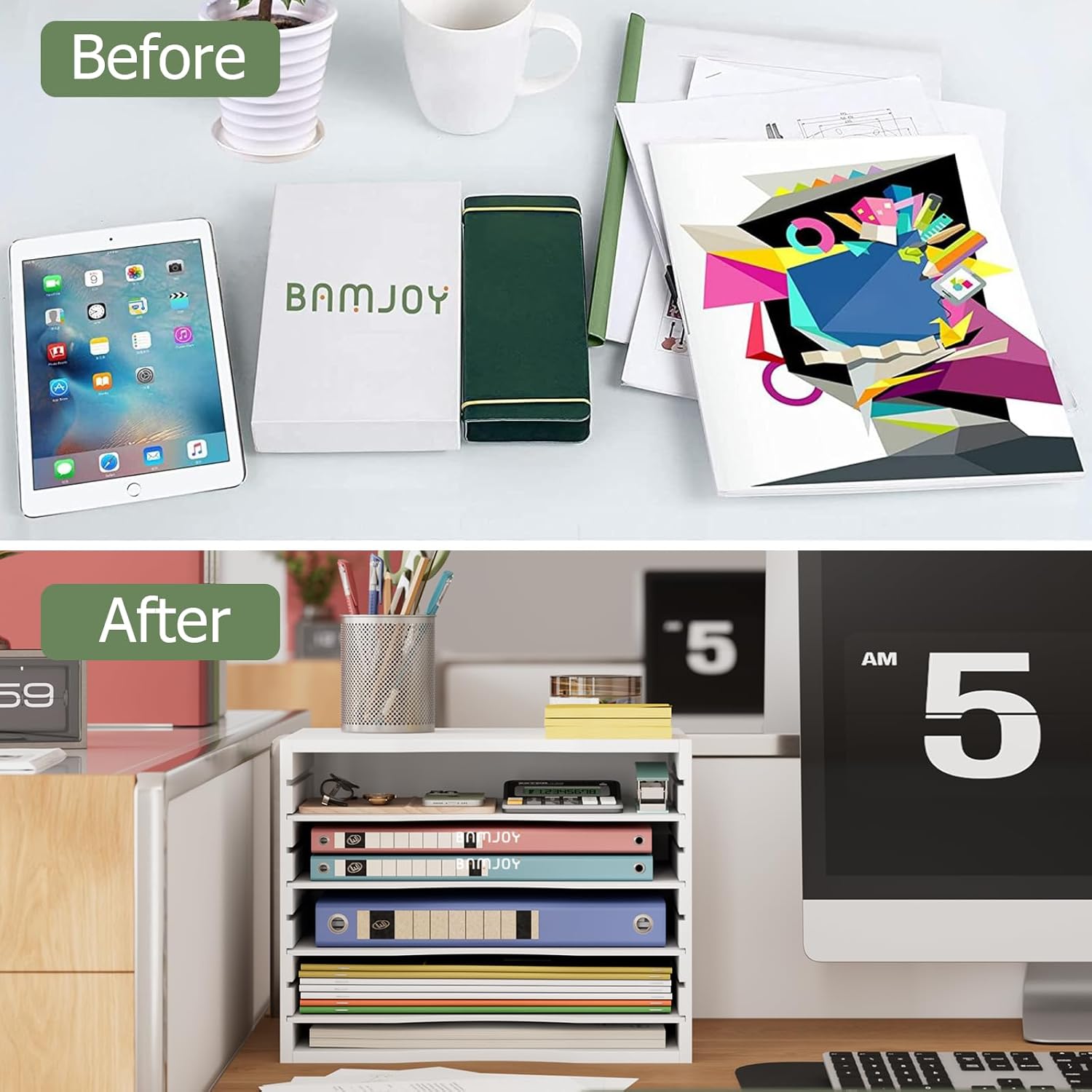 - 【NEAT YOUR DESKTOP】Help you to classify and store your various sizes of paper, file folder, magazines, staples, calculators, notebooks or any other documents, came with 4 MDF dividers can be adjusted freely according to your needs. Bamjoy file sorter organizer will make your home office, classroom, kids room much more organized.