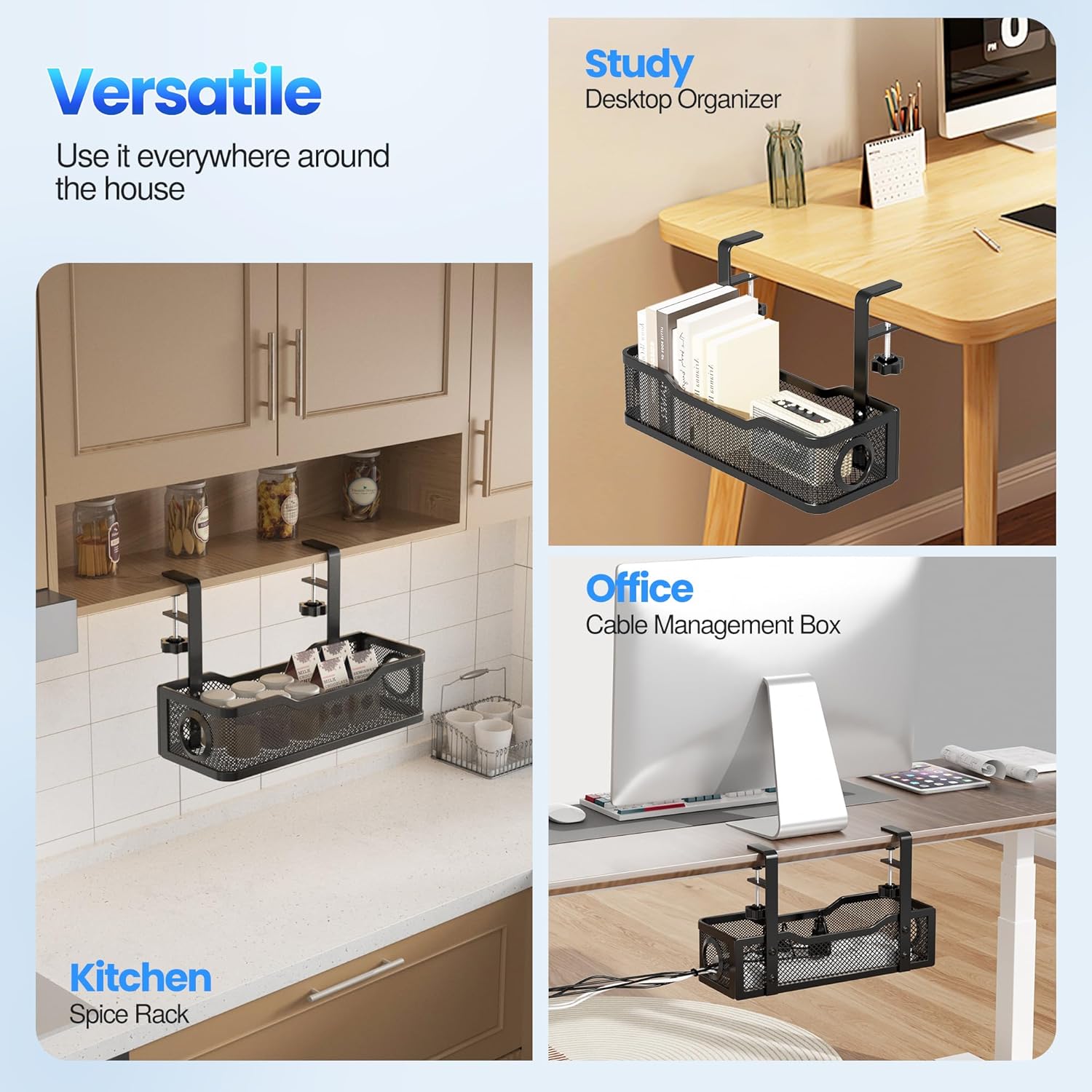 2 Pack Cable Management Under Desk Tray, No Drill Cable Management Box with Clamp for Wire Organization, Cord Organizer for Office, Home - No Damage to Desk (Black)