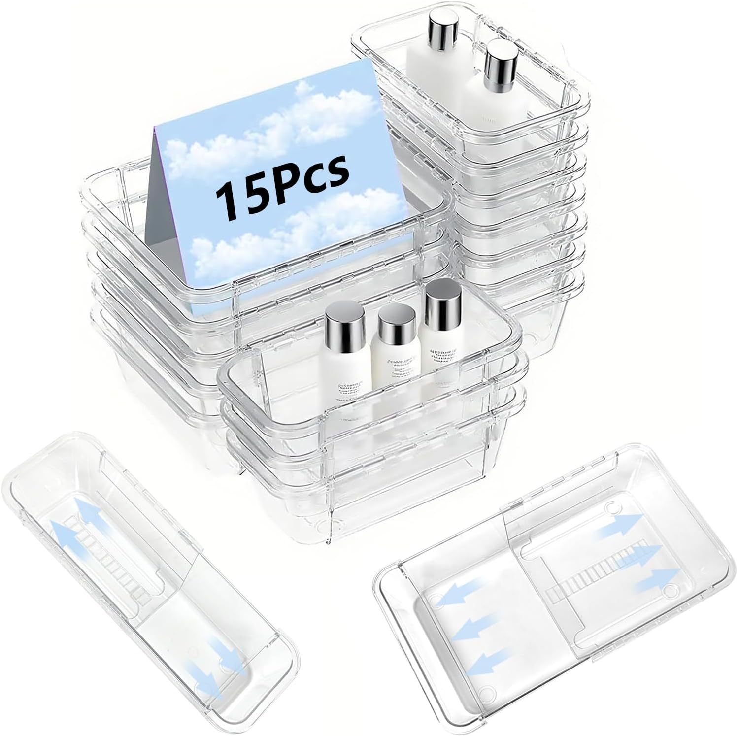 15 Pcs Clear Extendable Drawer Organizer,Adjustable Vanity Storage Box, 2-Size Desk Drawer Organizer, Acrylic Storage Bin for Makeup, Cosmetic,Desk Organizer Gadgets for Bathroom Bedroom Kitchen