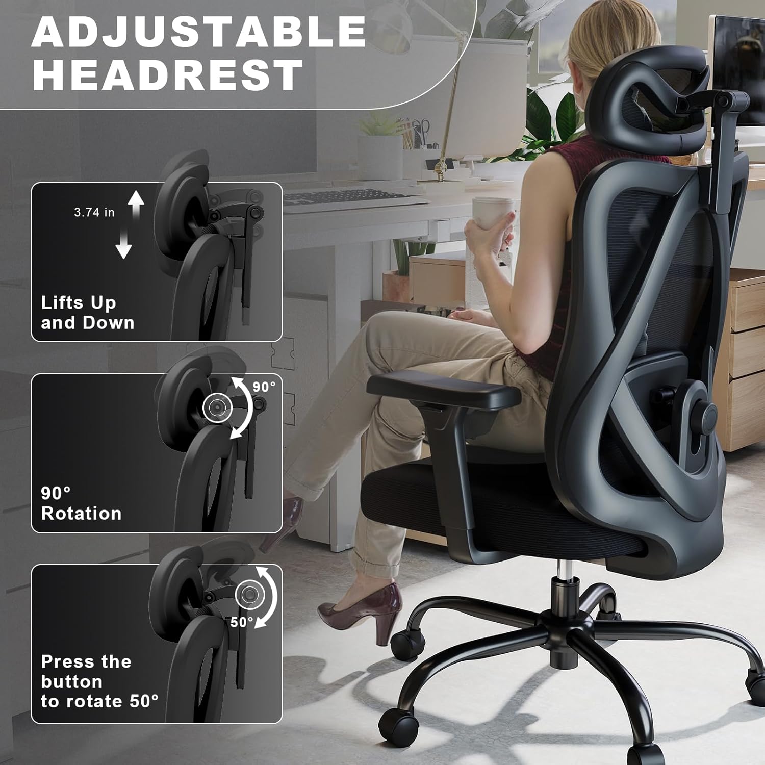 Ergonomic Office Chairs with Adjustable Headrest and Lumbar Support, High Back Mesh Home Computer Desk Chairs with 3D Armrest, 360° Swivel Wheels and Rocking Function, Black