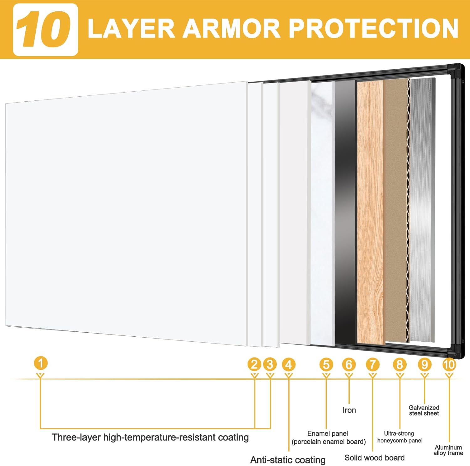 - ✔️ Luxury Belgian Enamel Surface - The 8’x4’ magnetic dry erase board made of imported high-gloss porcelain steel delivers ultra-smooth writing, effortless wiping, and ZERO ghosting even after years of heavy use. Also, This whiteboard is both waterproof and fireproof, and it’s very eco-friendly.