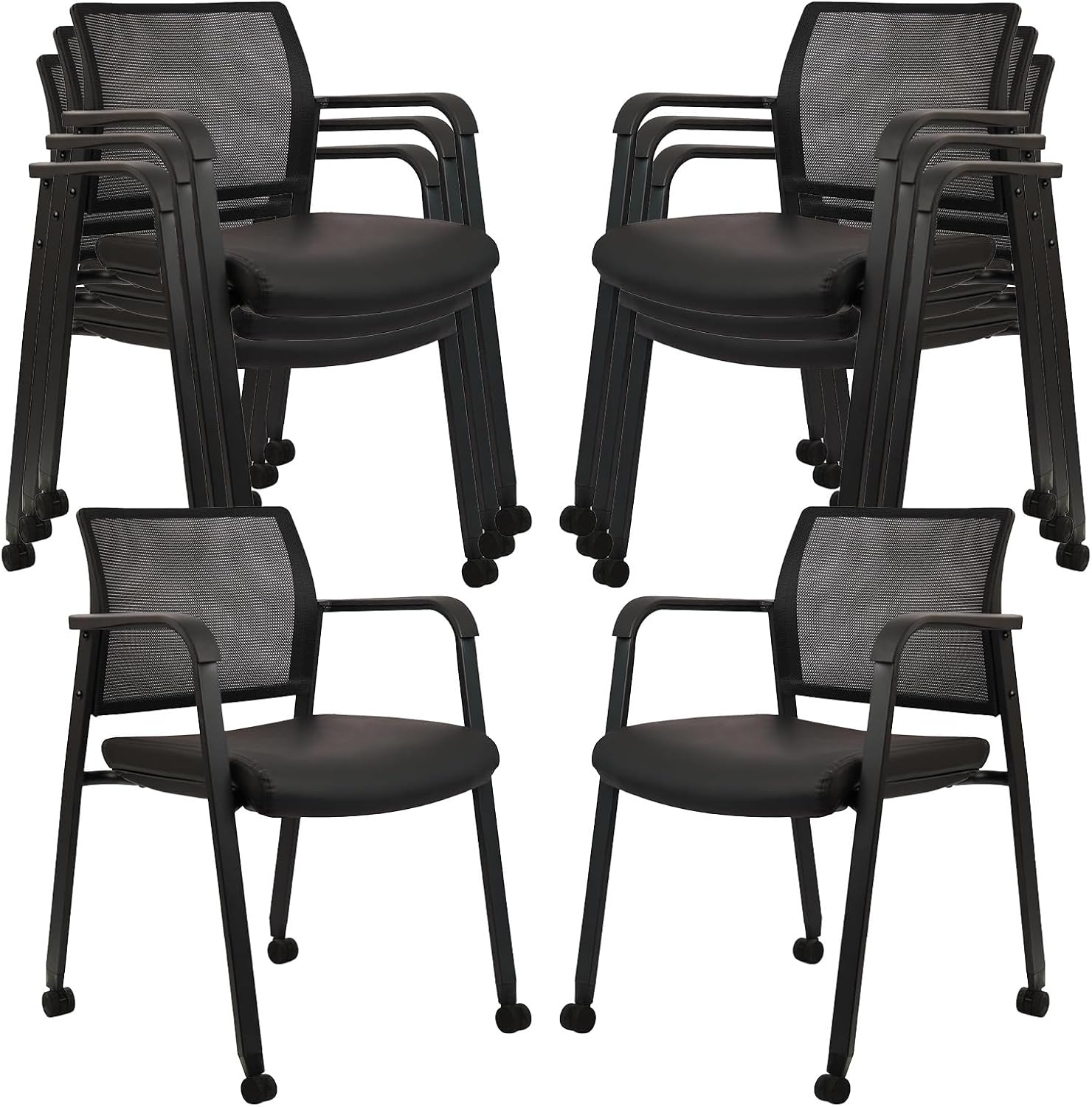 CLATINA Stacking Office Chair with Wheels, Mesh Back Waiting Room Guest Chairs with Arms Comfortable Leather Cushion Stackable Desk Chair for Conference Reception School Side Stationary, Black, 8 PK