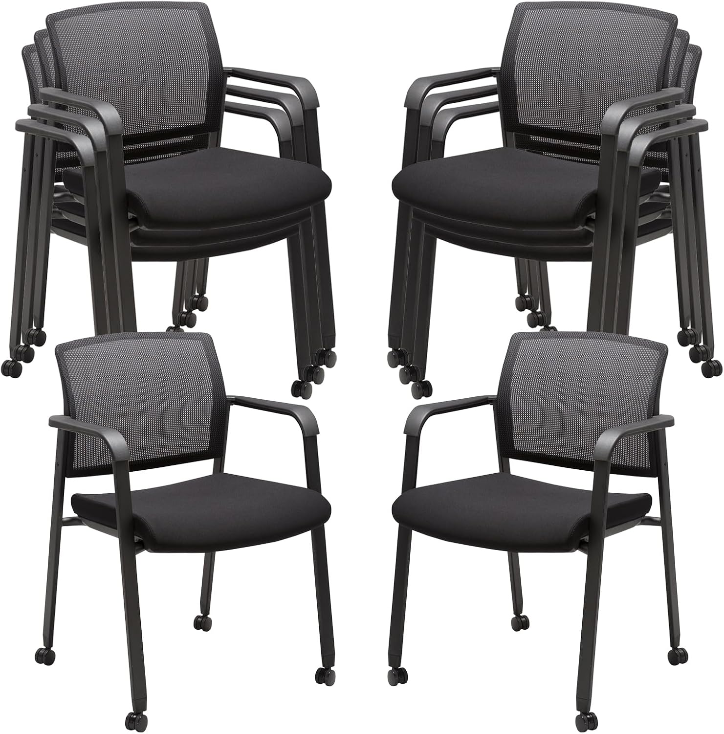 CLATINA Mesh Back Guest Reception Arm Chairs with Wheels, Waiting Room Chairs with Upholstered Fabric Seat and Ergonomic Lumbar Support for Office, 8PK