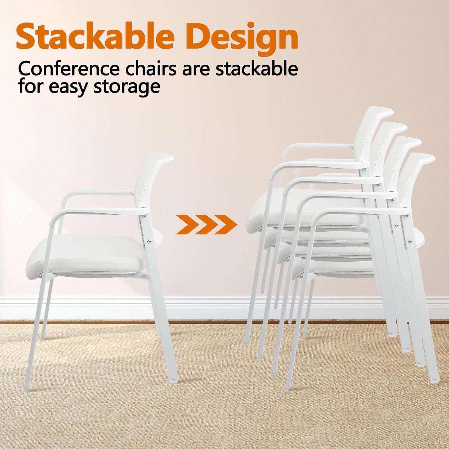 CLATINA Stacking Office Chairs | Mesh Back, Thicken Leather Seat and Arms, Ergonomic Lumber Support | Guest Reception, Waiting, Conference, School, Party, Customer, Side, Stationary | Set of 8, White