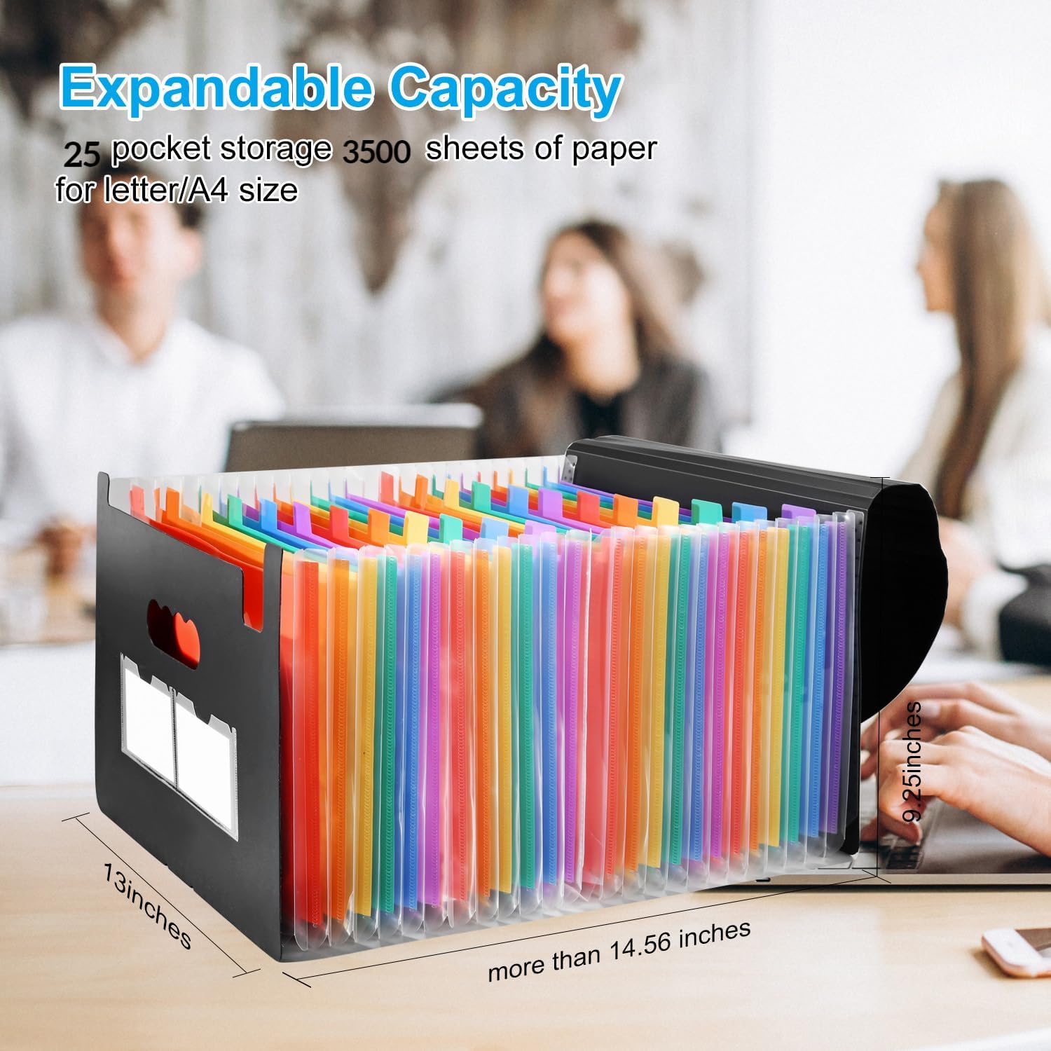 - 【Large Capacity accordion folder organizer】Upgraded version Expanding File Organizer with 25 pockets can be suitable for all A4 files and letter size files, making our paperwork well-organized. Expandable expandable folder size is 13 "x 9.25", can be extended to 20”, stand steady itself, which can store more than 3500 sheets of Letter/A4 size paper. A pen holder slot and 2 transparent card slot ensure your more office supplies storage need