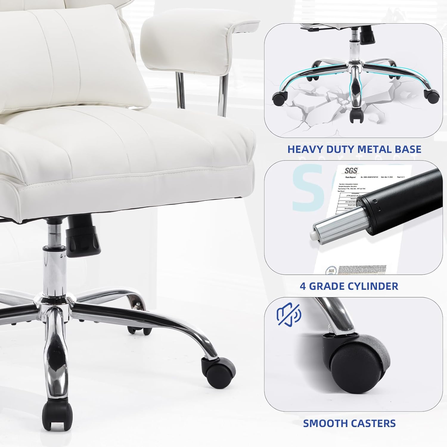 - πΊπππππ: Leather office chair built on a foundation of durability. Heavy-duty metal base and SGS-certified 4-Grade lift cylinder ensure not only steadfast executive chair stability but also peace of mind with big and tall office chair every adjustment.
