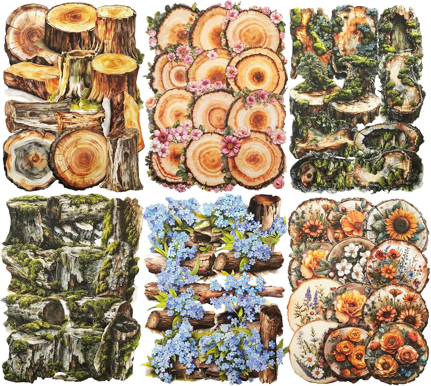 Nature Wood Slice Sticker Set, 120PCS Vintage Designs with Flowers, Moss, Logs and Botanical Elements for Journaling, Scrapbooking and Crafts