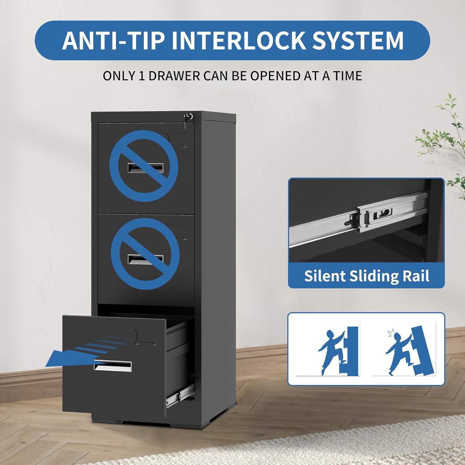 - ăSecure & Anti-tilt DesignăOur office filing cabinets with 3 drawer feature a locking mechanism and anti-tip feature. When one drawer is opened, the interlocking drawer system prevents the other drawers from opening, preventing tip-overs and increasing safety.