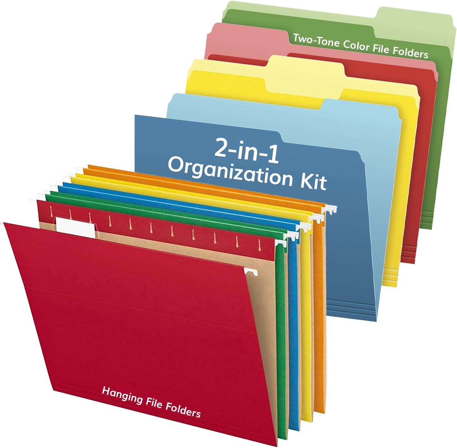 - Efficient Organization: The hanging files are perfect for organizing invoices, receipts, client files, and more, with 1/5-cut tabs for customizable labeling. The Two-Tone Color File Folders feature 1/3-cut tabs and are ideal for quick and efficient organization of important documents, bills, and school papers.