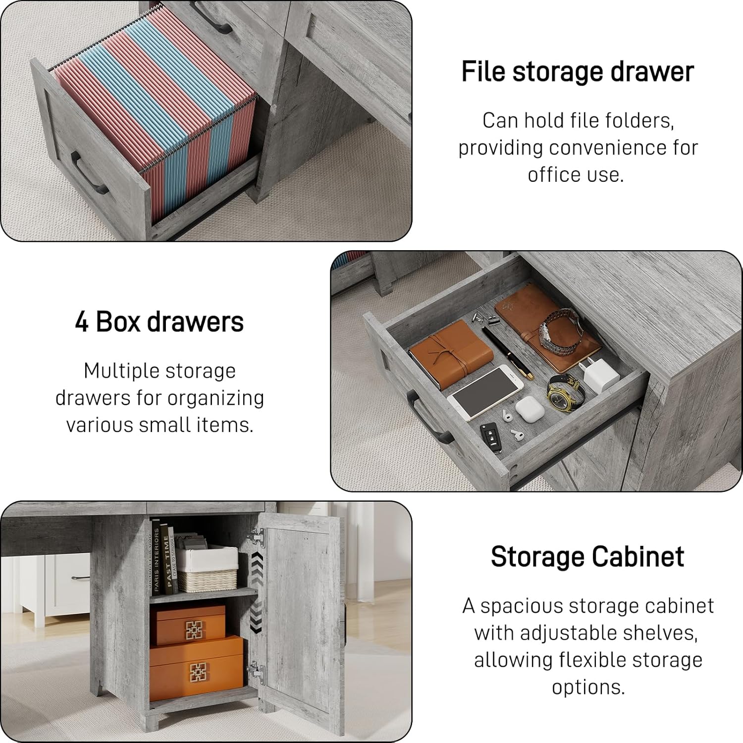 Farmhouse 67''H Executive Desk with Hutch & 5 Drawers, Rustic Office Desks Computer Desks with Charging Station, File Drawers and Storage Cabinets, Wood Workspace for Home Office & Study.(Grey).