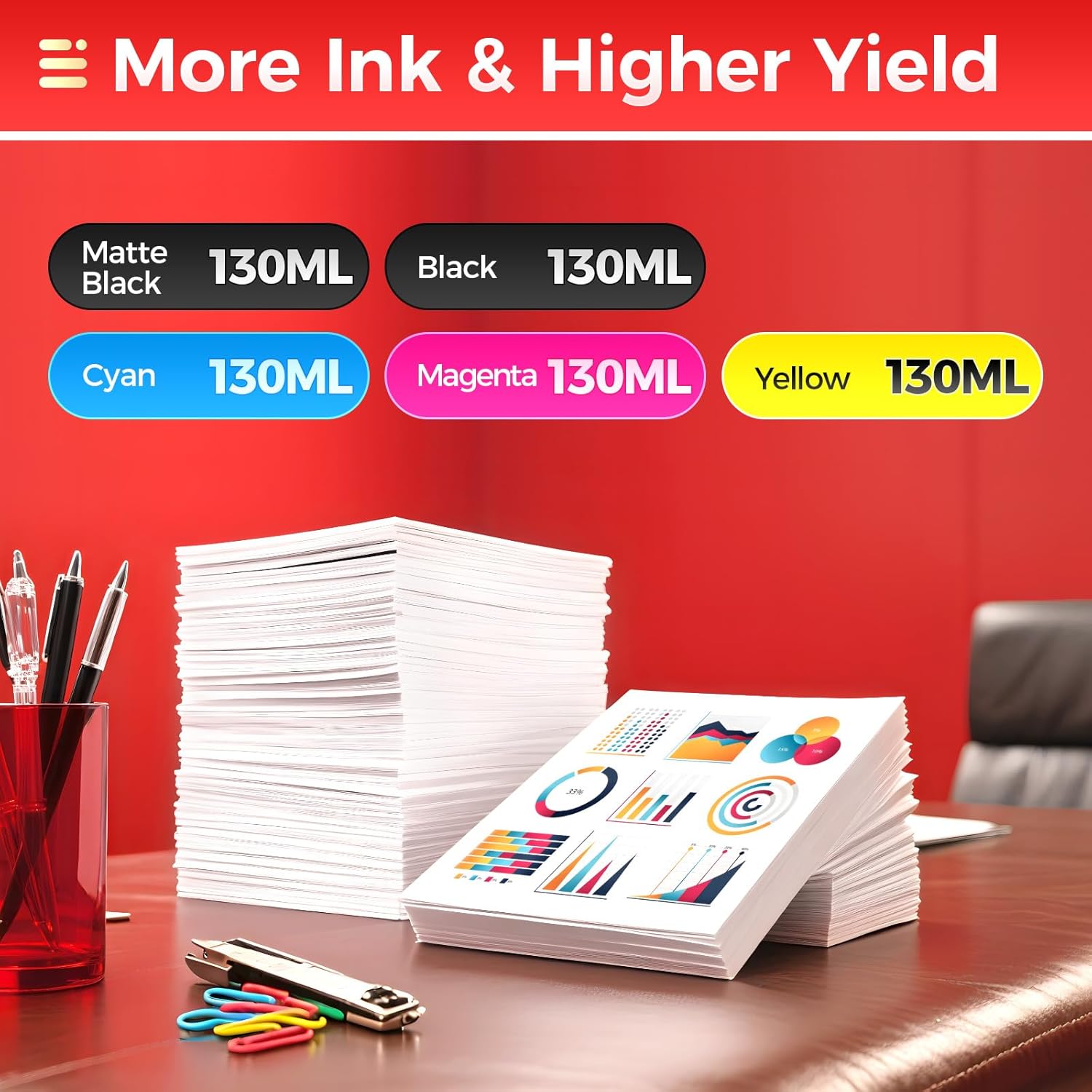 - Ink Volume: Total ink volume is 650ml(130ml/pack, total 5-pack) which include 1 pack PFI-107MBK PFI-107 Matte Black (Pigment ink), 1 pack PFI-107BK PFI-107 Black (Dye ink),1 pack PFI-107C PFI-107 Cyan (Dye ink),1 pack PFI-107M PFI-107 Magenta (Dye ink), 1 pack PFI-107Y PFI-107 Yellow (Dye ink).