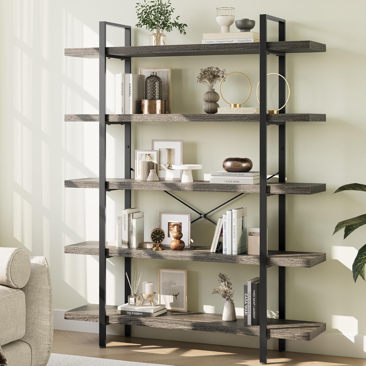 Heavy Duty 5-Tier Industrial Bookcase, 47" Wide Wood Bookshelf for Home Office, 120lbs Shelf Capacity, Rustic Shelving Display with Reinforced Horizontal Shelf for Living Room Bedroom,Grey