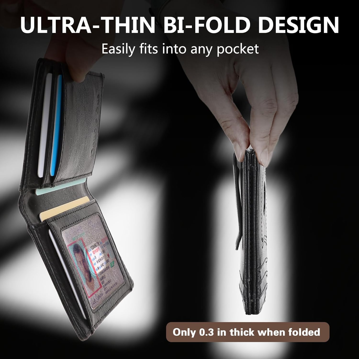 - Slim & Large Capacity:This slim bifold card wallet for men,measures 0.63x4.49x3 inches, 12 card slots including 1 ID windows,with money clip credit card wallet,5-10 bills for quick access when traveling,store/workplace. this slim front pocket wallet fits perfectly in your pocket,compact wallet perfect for daily carry