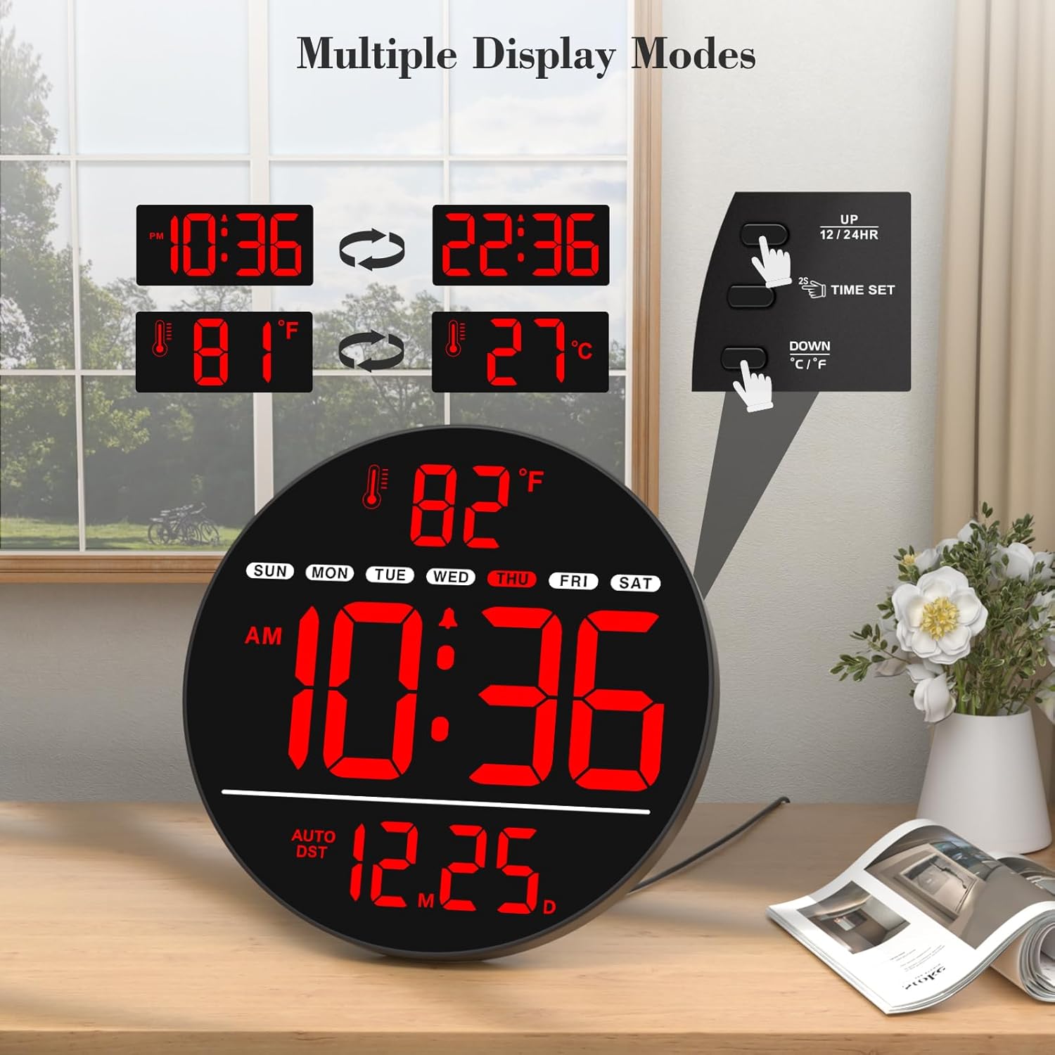 WallarGe Large Digital Wall Clock with LED Display, Electric Wall Clock with Temperature, Auto DST, Date, and Day, 5-Level Brightness for Office, Bedroom, Living Room, Classroom Décor